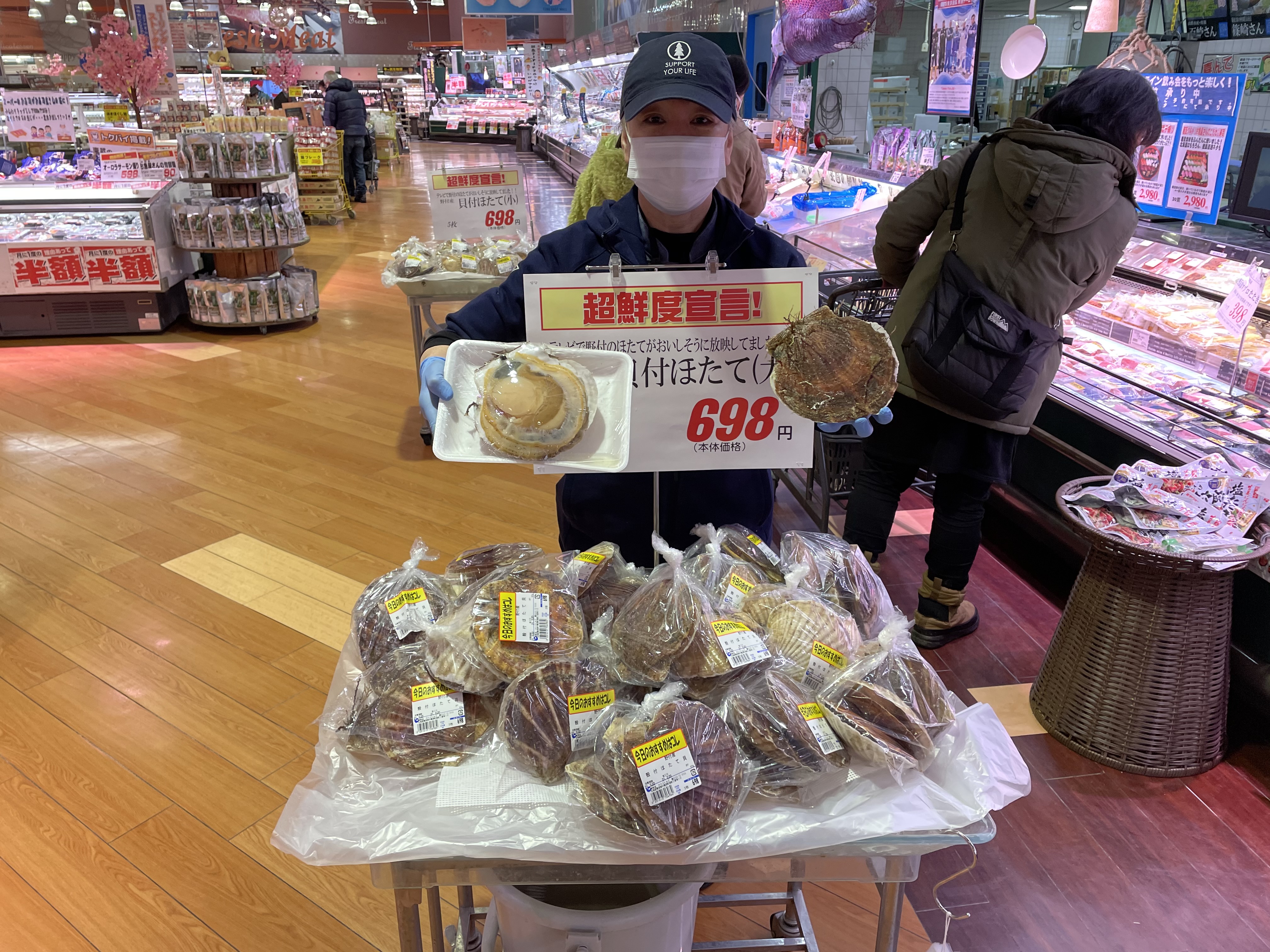 おはようございます。今日は肉厚で身が甘いほたてです!お刺身はもちろん、バター焼きがイチオシです。ぜひ、ご利用下さい。