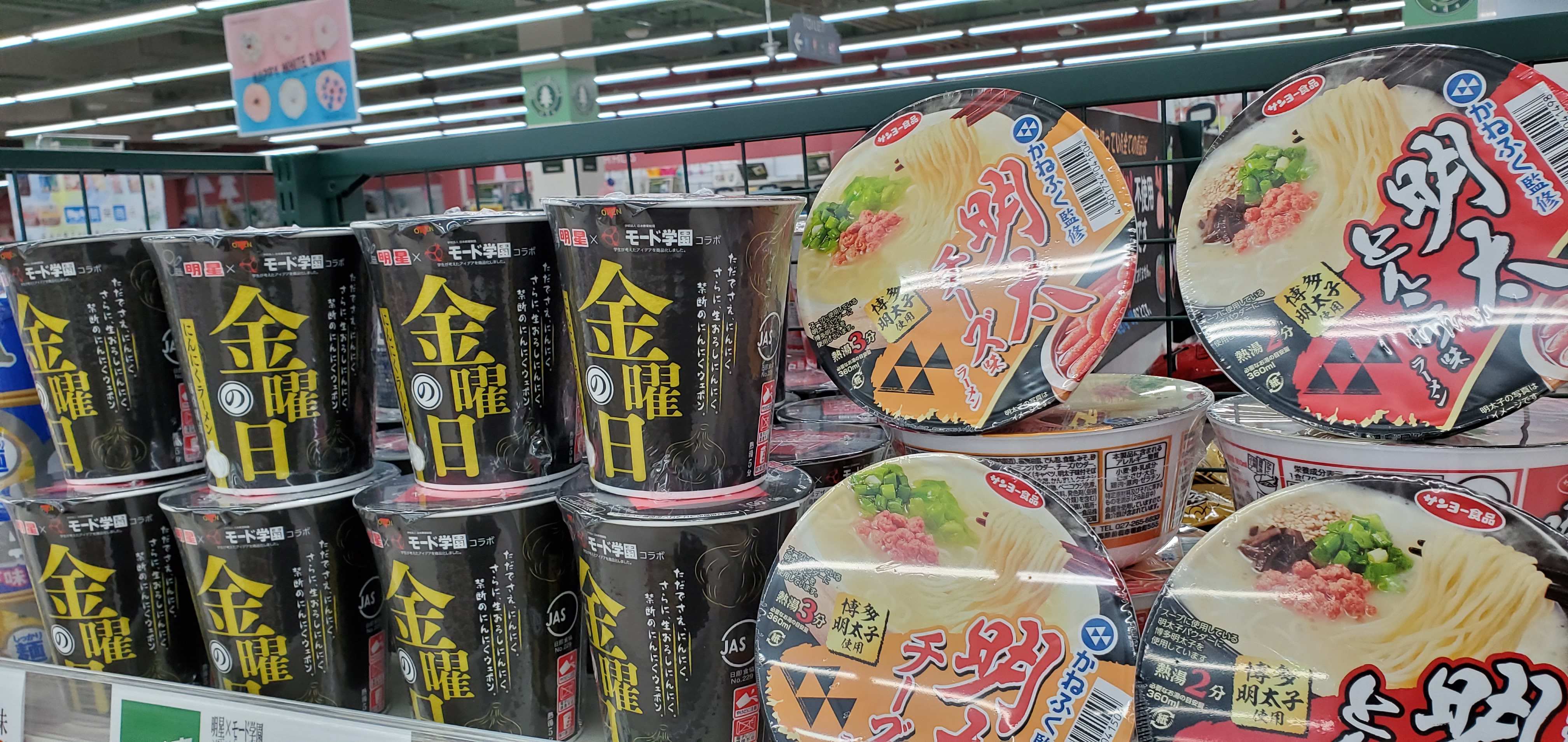 今、面白いカップ麺が続々入れ替わりで入荷しています。明星×モード学園とのコラボ商品の金曜日のニンニクラーメンとかはちょうど今日が金曜日なのでお昼や夜食にいかがですか?その他、10種類以上の面白いカップ麺があります。限定につき、是非ご利用お待ちしております。(^o^)/