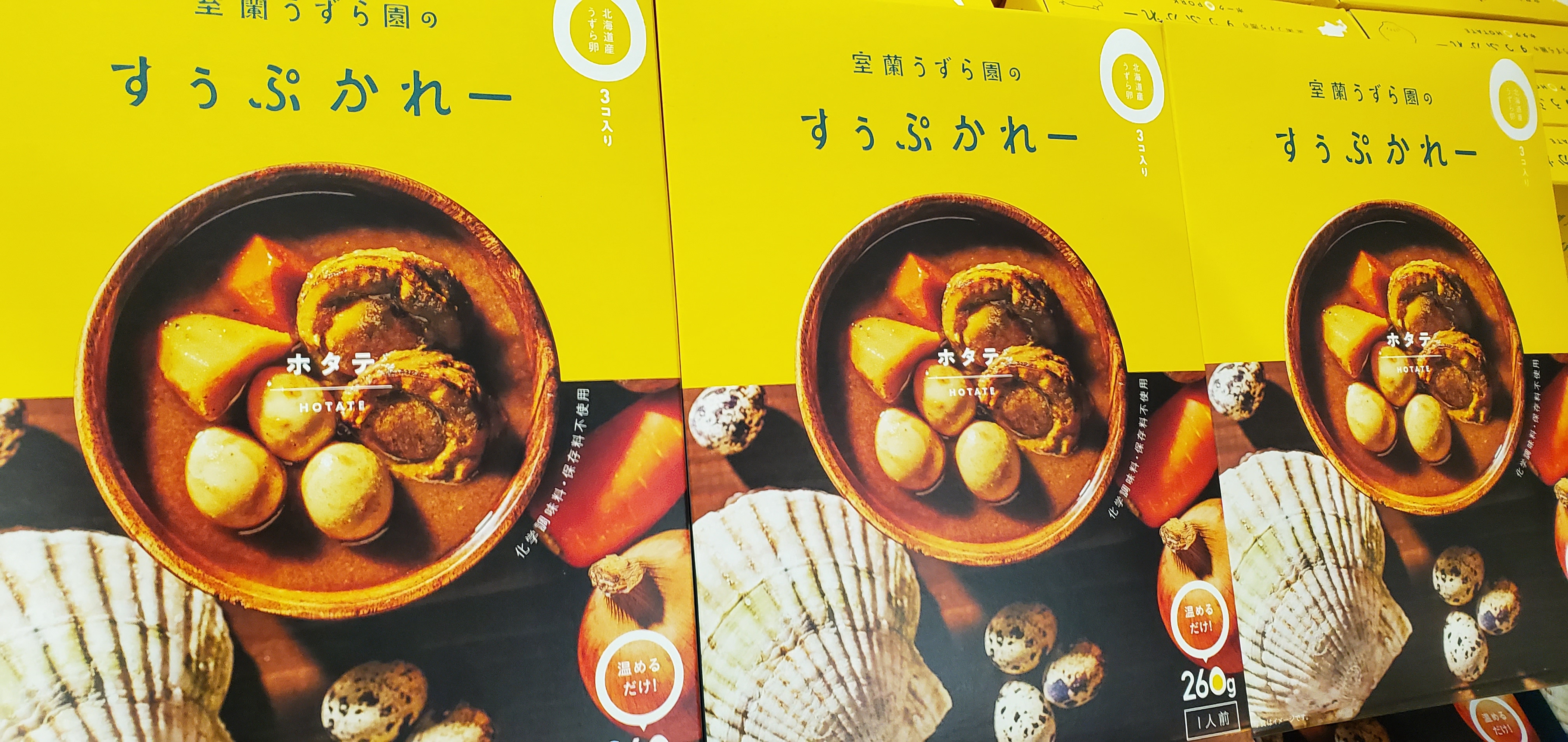 北海道うずら園がつくるカレーレトルトです。贅沢なホタテとポークの2種類あり、それぞれにこちらでできたうずらの卵も入ったスープカレーです。ぜひ、味わってほしいカレーです。ご利用お待ちしております。(^o^)/