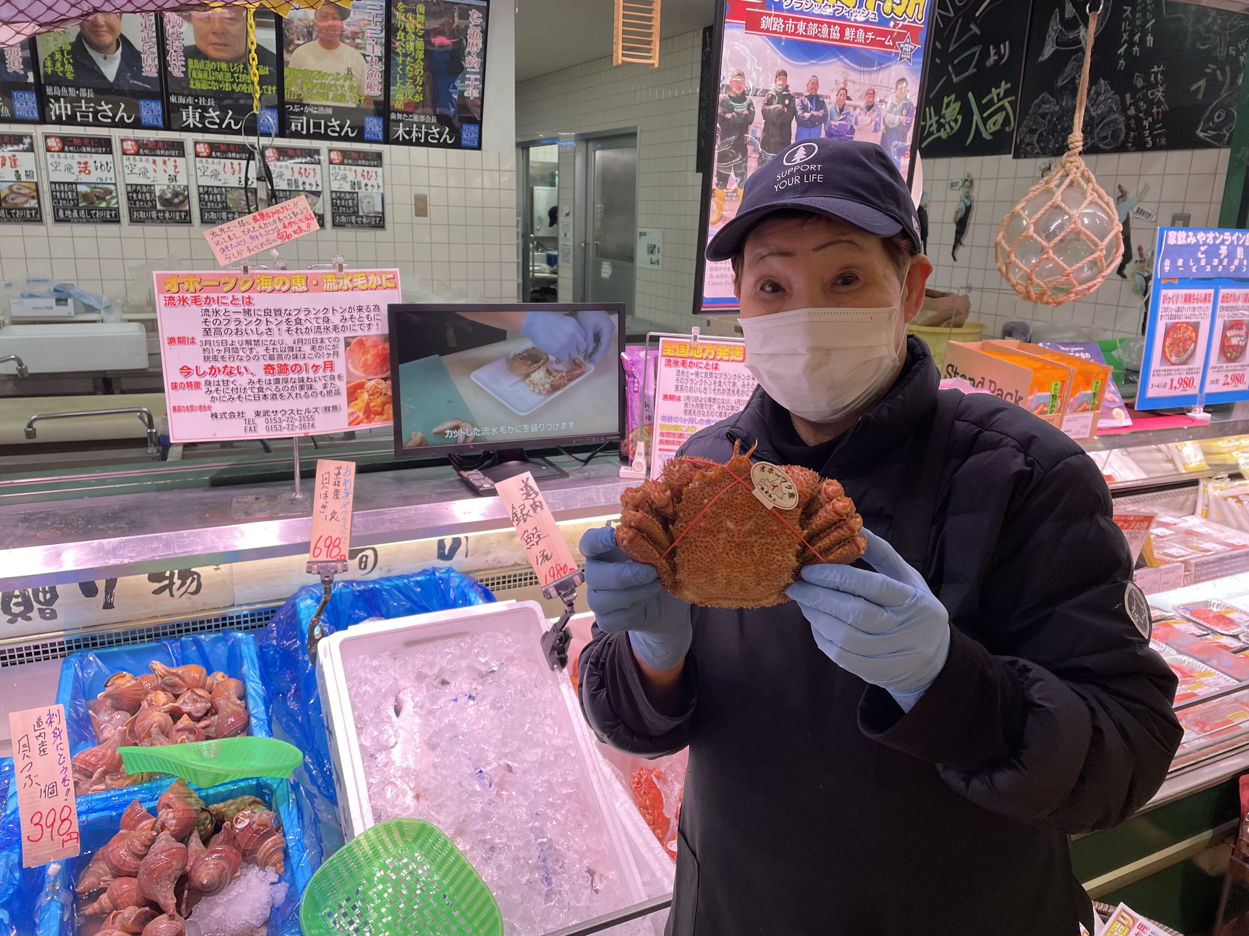 おはようございます。今日は今が旬の流氷毛かにです。身がパンパン、みそたっぷりのおいしい毛かにです。地方発送も承っておりますのでぜひ、ご利用下さい。