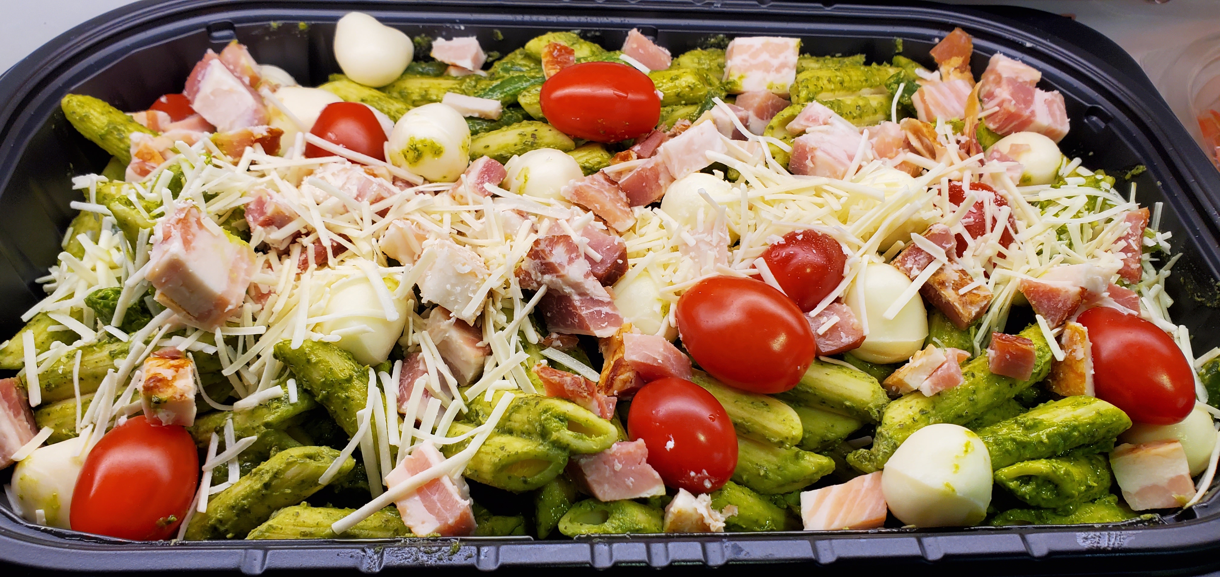 レンジで温めるだけで食べることができてお手軽だし、ボリュームもあるバジルベースのソースで和えた「ペストジェノベーゼペンネ」です。固茹でされたペンネリガーテが見えなくなる程に表面を覆ったシュレッドチーズにコロッとしたモッツァレラチーズ、ゴロッと入ったトマトと角切りベーコンもたっぷり!本日限りの限定商品