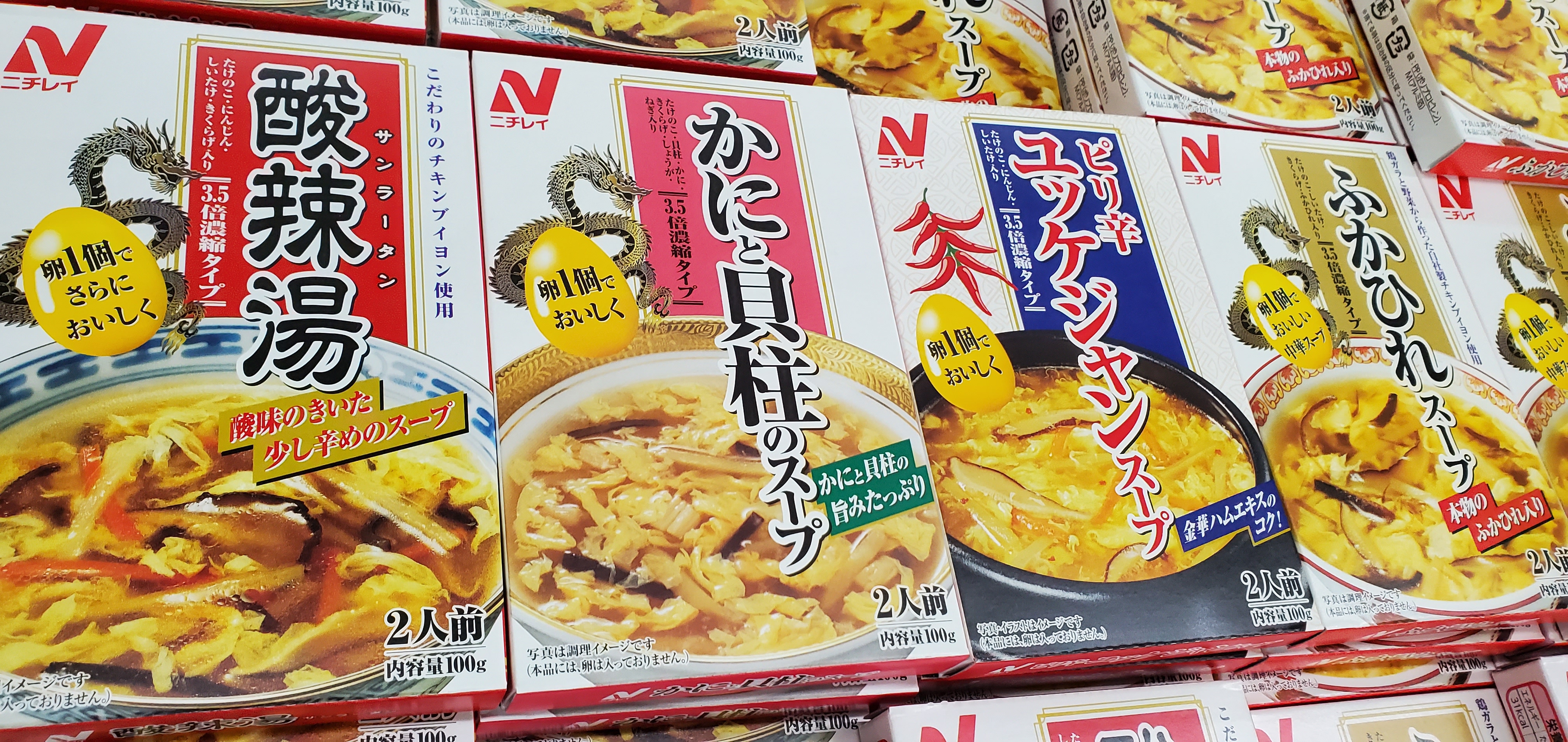 ニチレイからたまご1個で美味しいスープが4種類でました。限定販売でどれも¥108(税込)とお買い得です。ぜひ、ご利用お待ちしております。(^o^)/