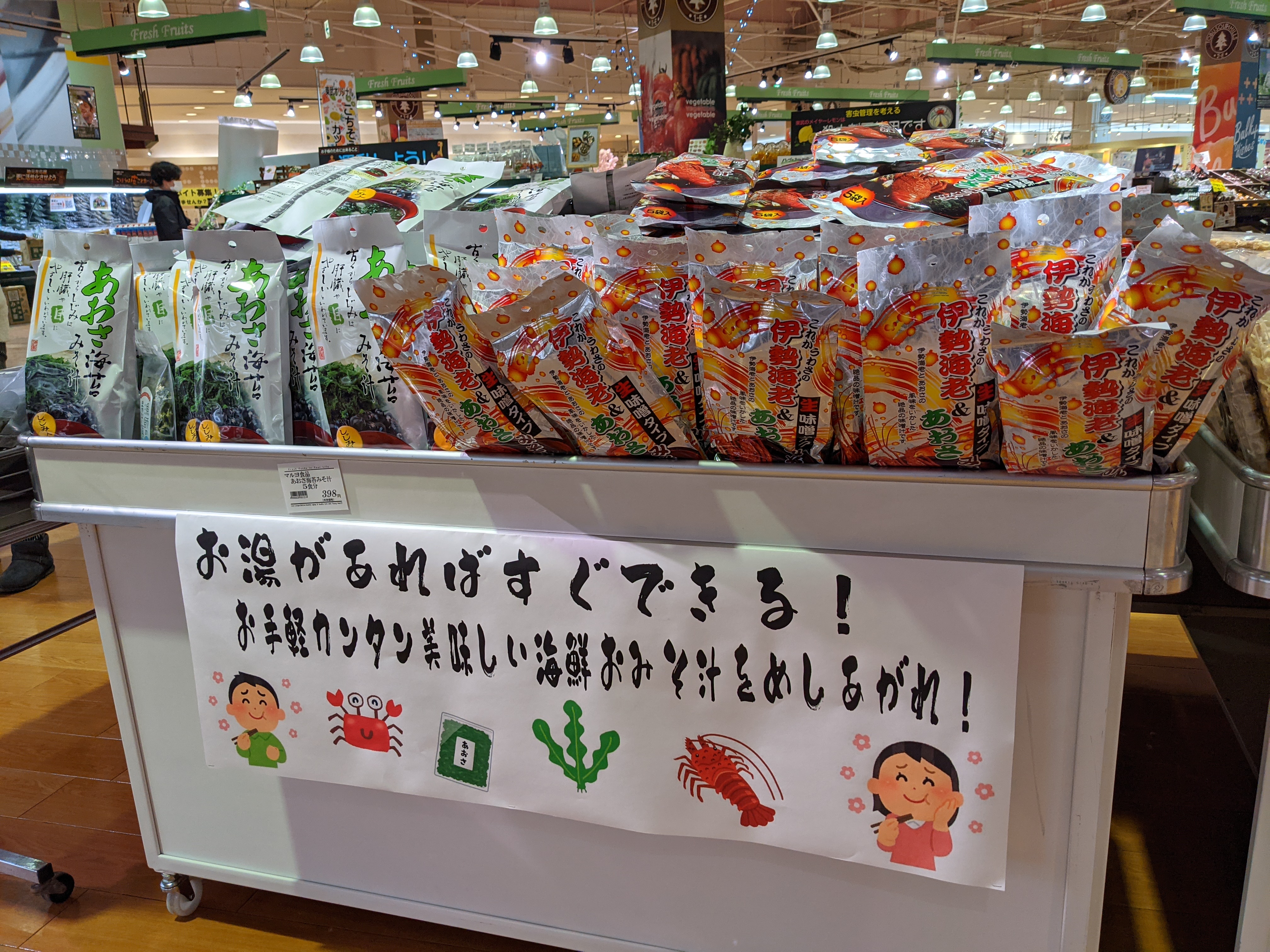 鮮魚コーナーでは簡単美味しい海鮮お味噌汁を販売中!お湯さえあれば海鮮のダシの効いた味噌汁を味わえますよ、種類も豊富に販売中!是非ご利用くださいませ