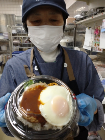 おはようございます。お惣菜コーナーではロコモコ丼を販売中。ジューシーで美味しいハンバーグ、味付けはデミグラスソースで。デミグラスソースは当店手作りとなっております、是非ご利用ください