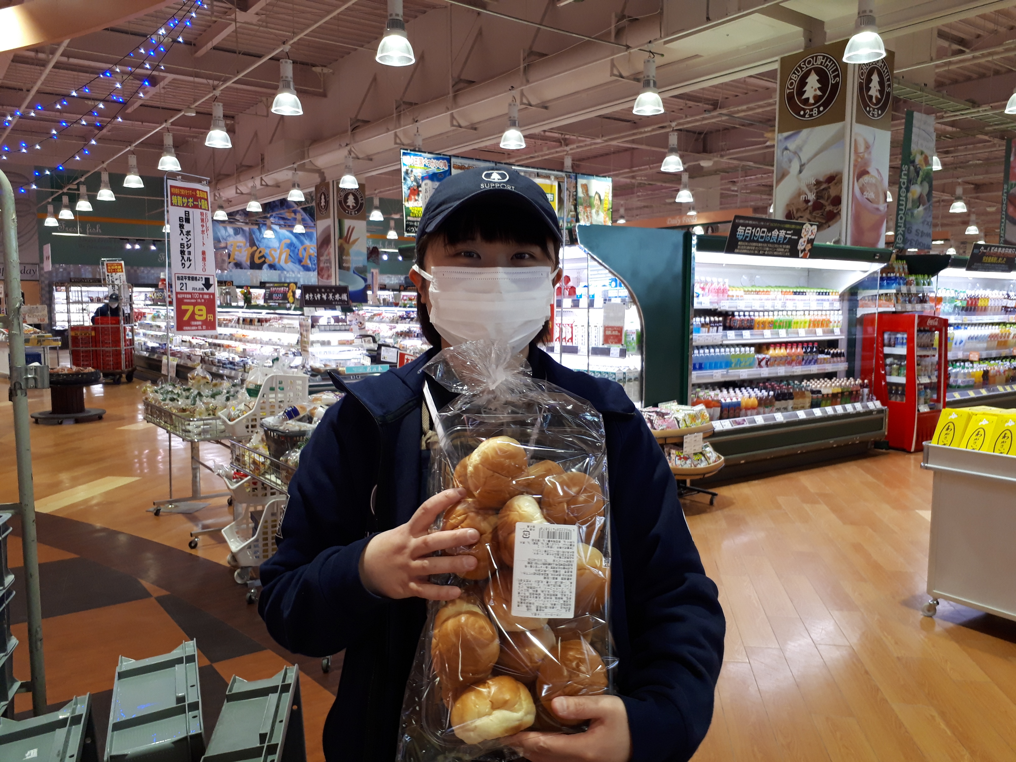 おはようございます。日配コーナーのおすすめは、日糧パンのお徳用パン。バターロール、塩パンなど大容量サイズを販売。ぜひ、ご利用ください。