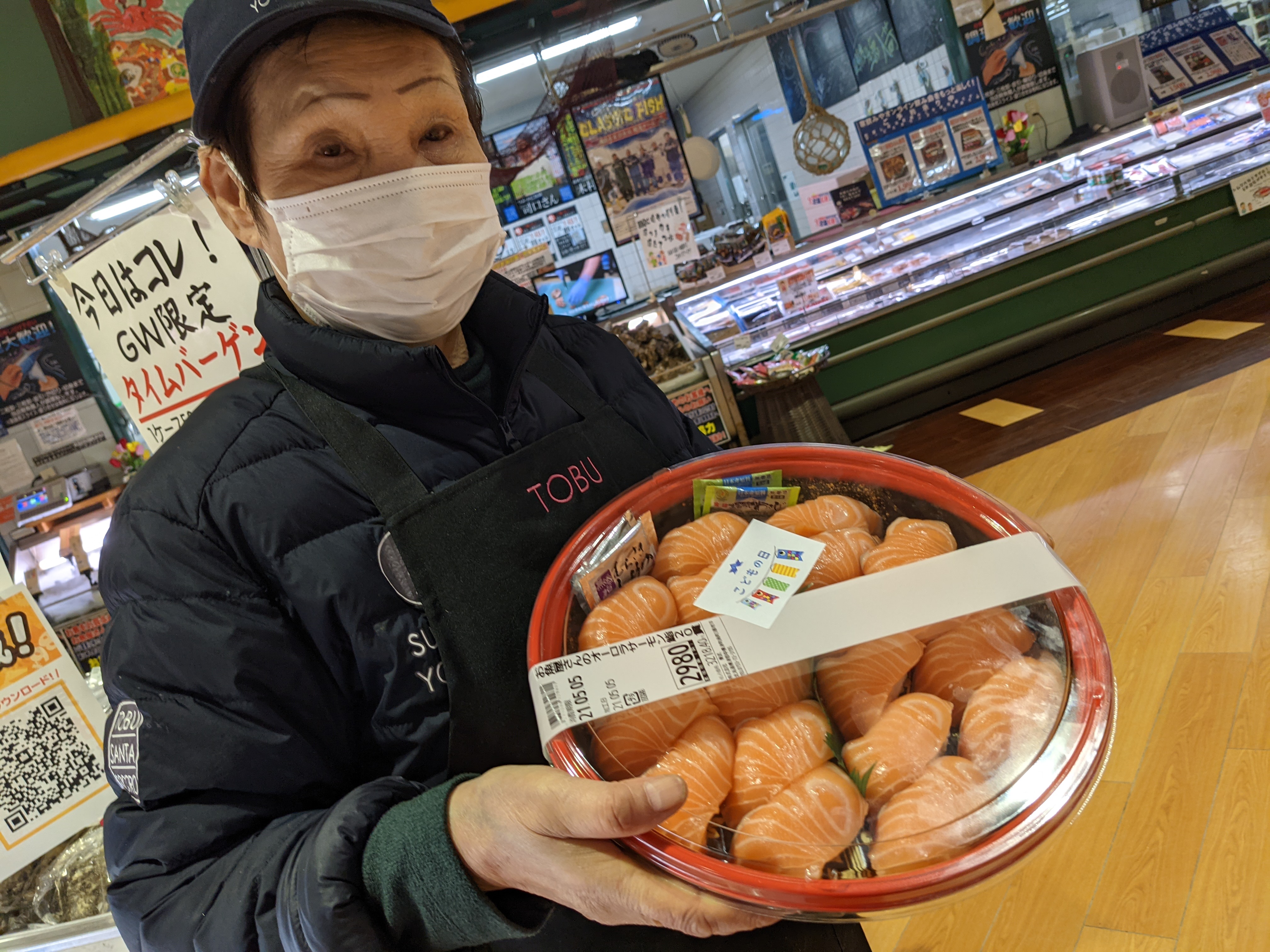 本日は子どもの日!鮮魚コーナーではごちそうメニューを販売中です!特にオーロラサーモンのお鮨がオススメです!是非ご利用くださいませ
