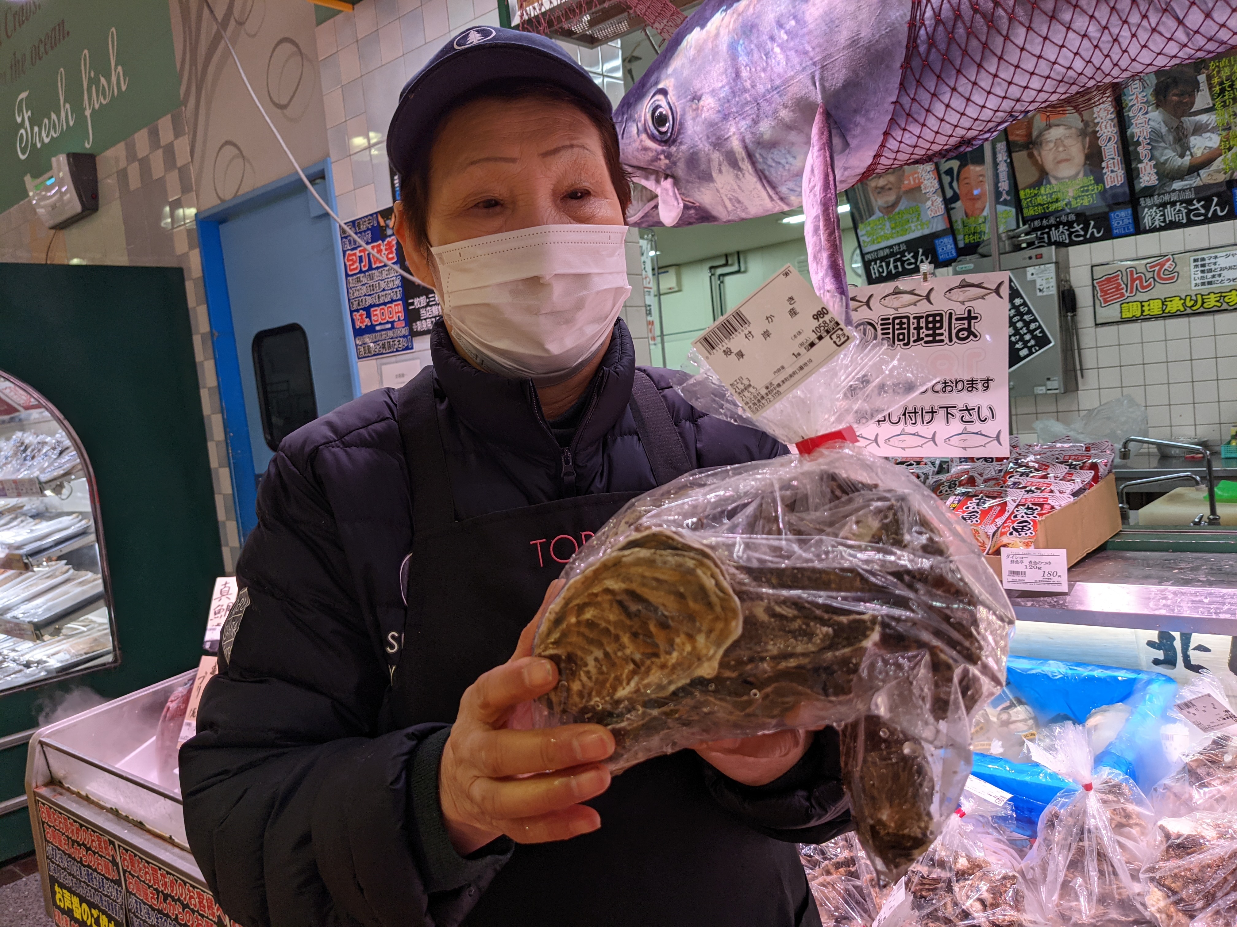 鮮魚コーナーではカキがお買い得!10個はいりまして980円!BBQ、酒蒸しに是非どうぞ!!