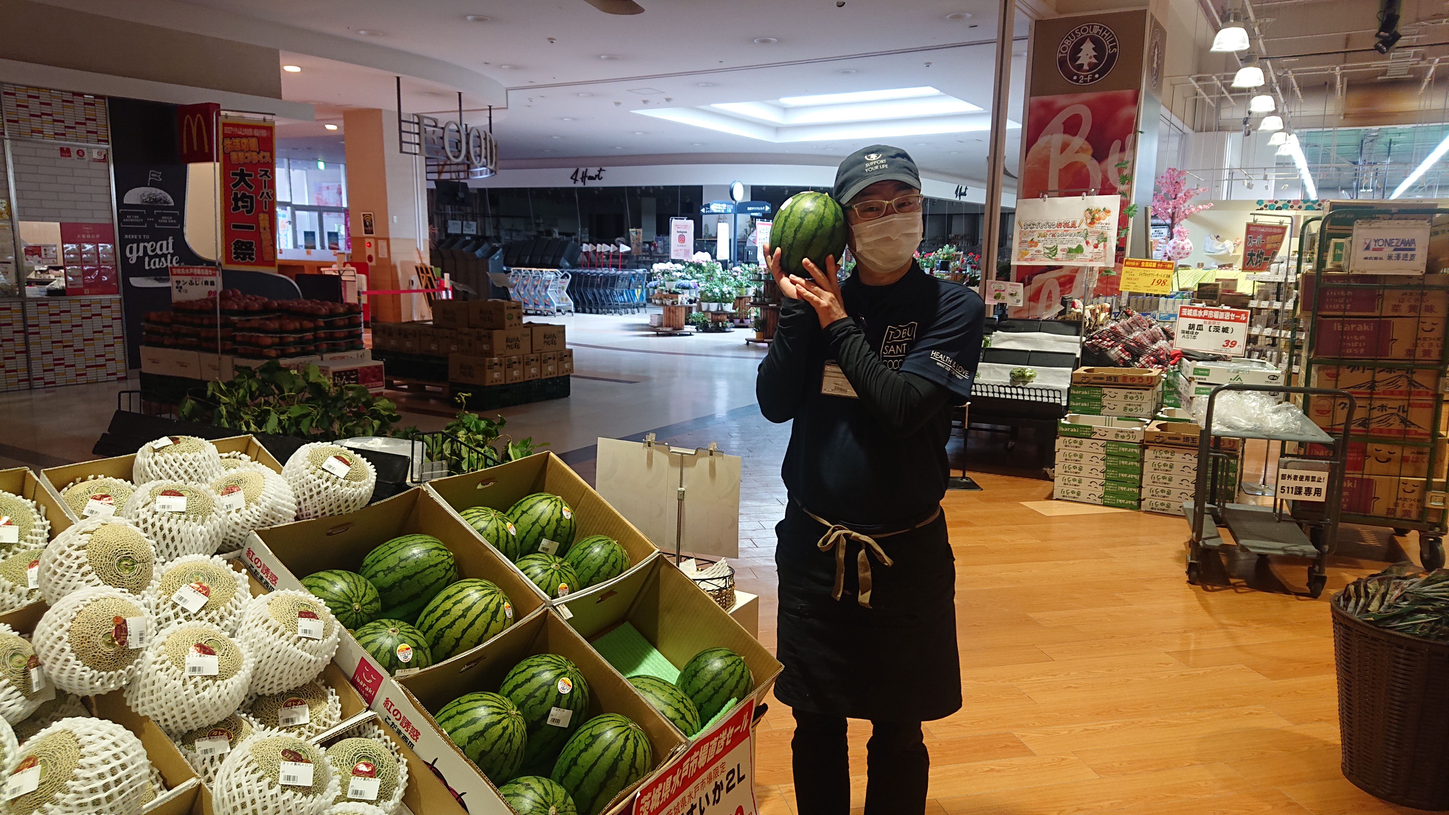 おはようございます!青果コーナーのおすすめは小玉スイカ です!小ぶりですが甘さは十分!とてもさっぱりして美味しいですよ!是非お買い求めください!