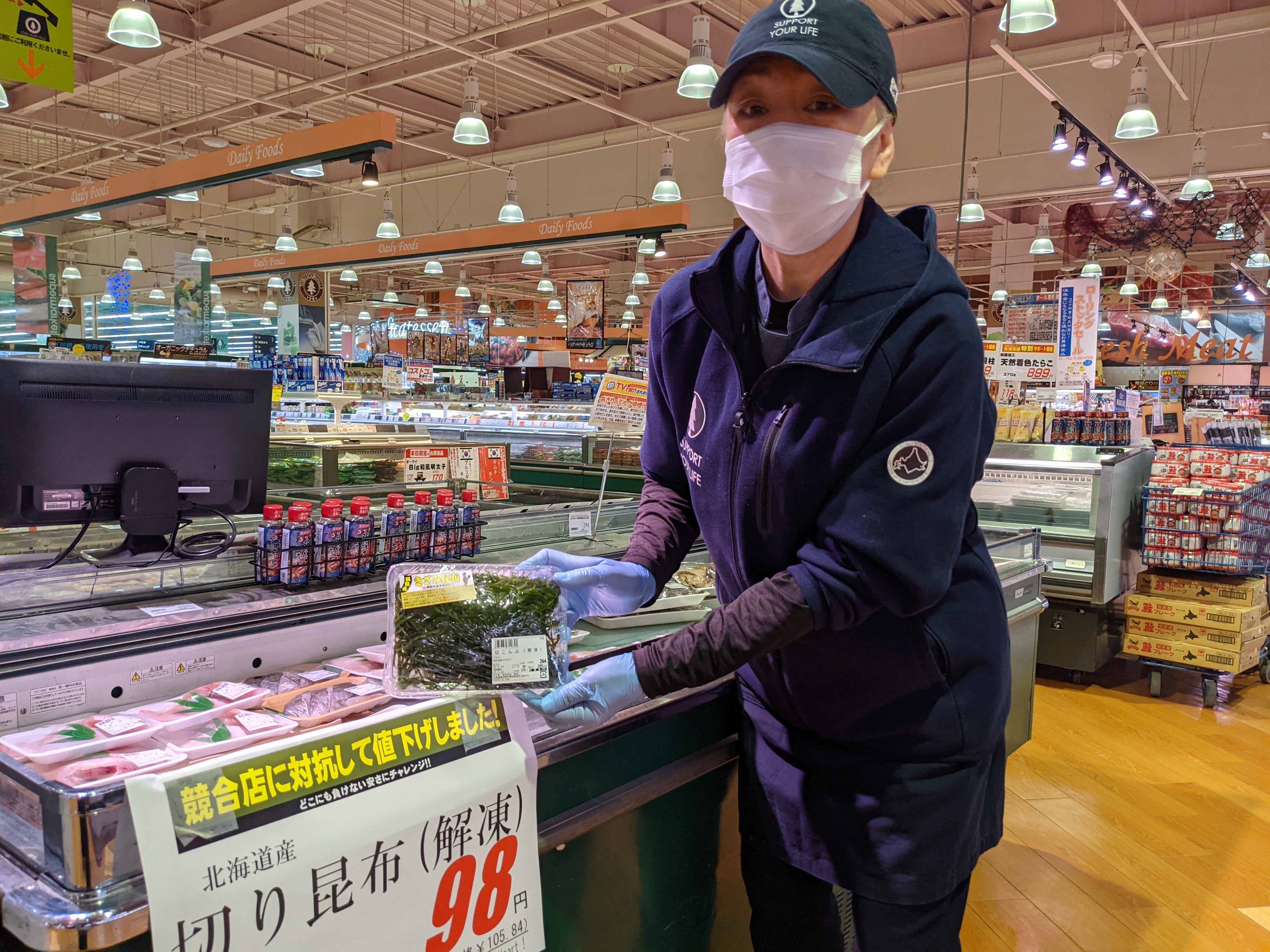 鮮魚コーナーでは切り昆布がお買い得!100gあたり98円ですよ!是非ご利用くださいませ