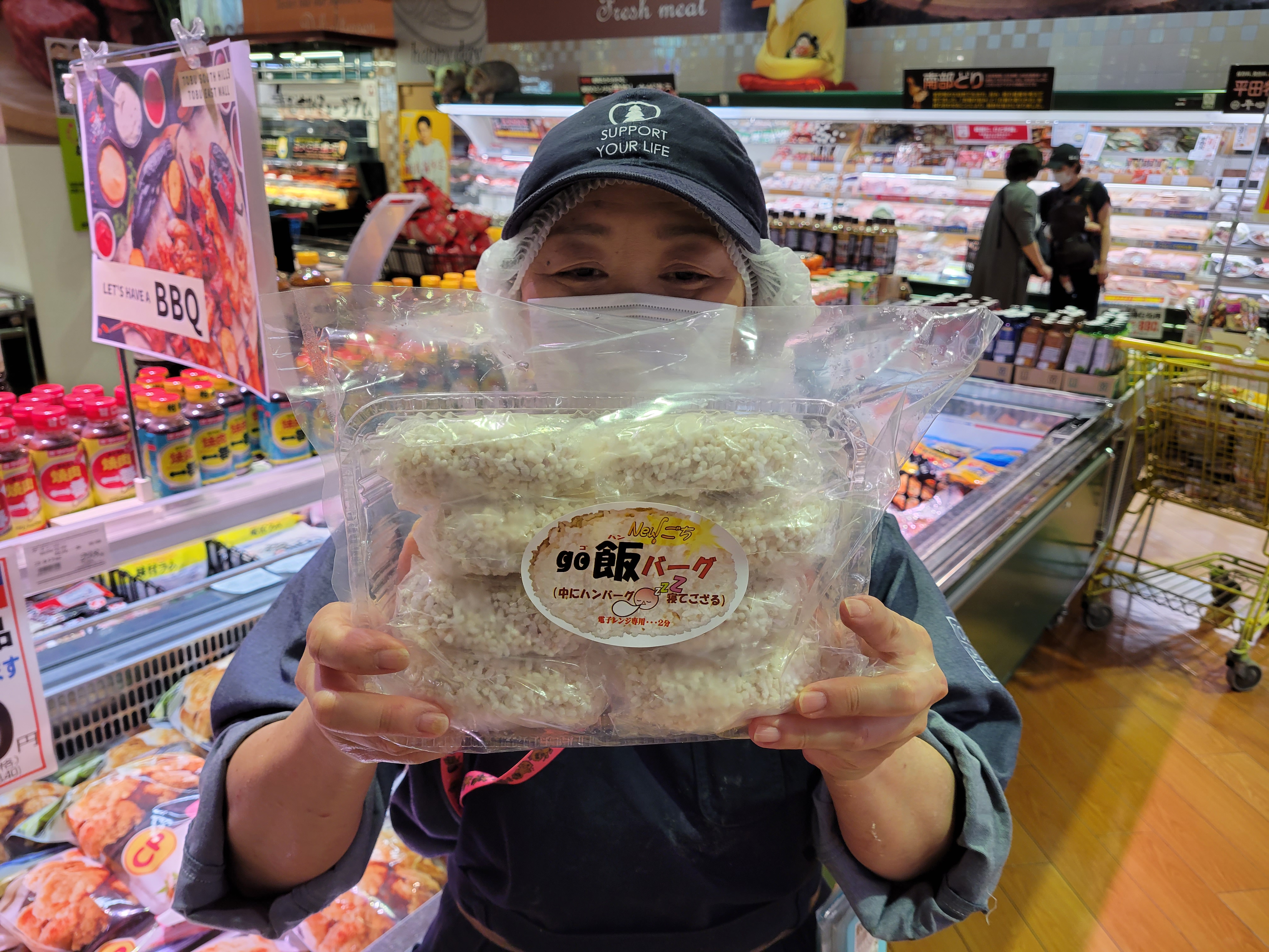 本日ミート担当、宮崎さんのおすすめはご飯バーグがイチオシです🎵生ハンバーグをご飯で包んでます生だから加熱でお肉の味がご飯に染みて、うんまーい‼️8個入って980円で販売中です、