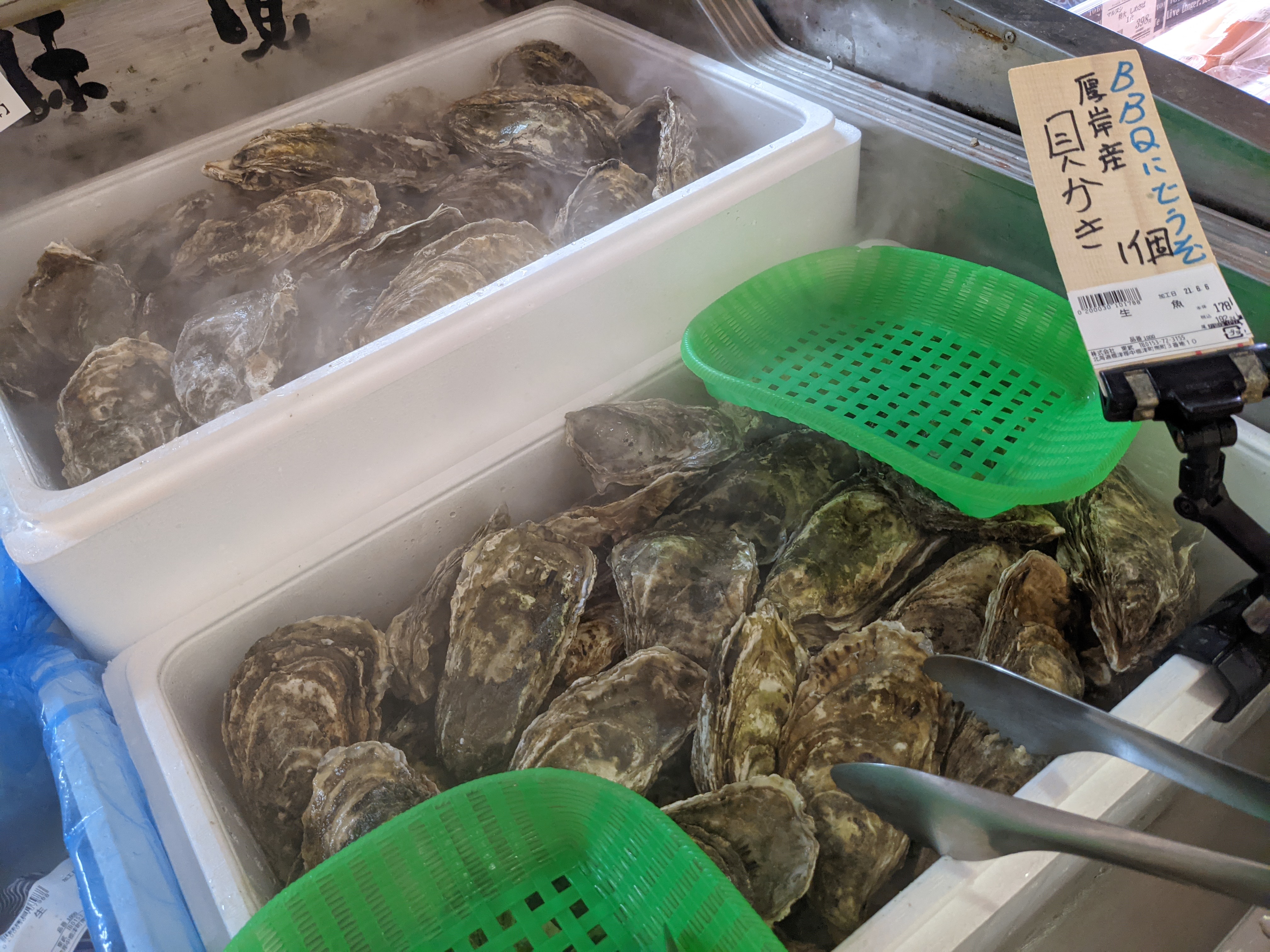 鮮魚コーナーでは大きなカキを販売中!BBQにはもちろん蒸してもうまいですよ〜、是非ご利用くださいませ
