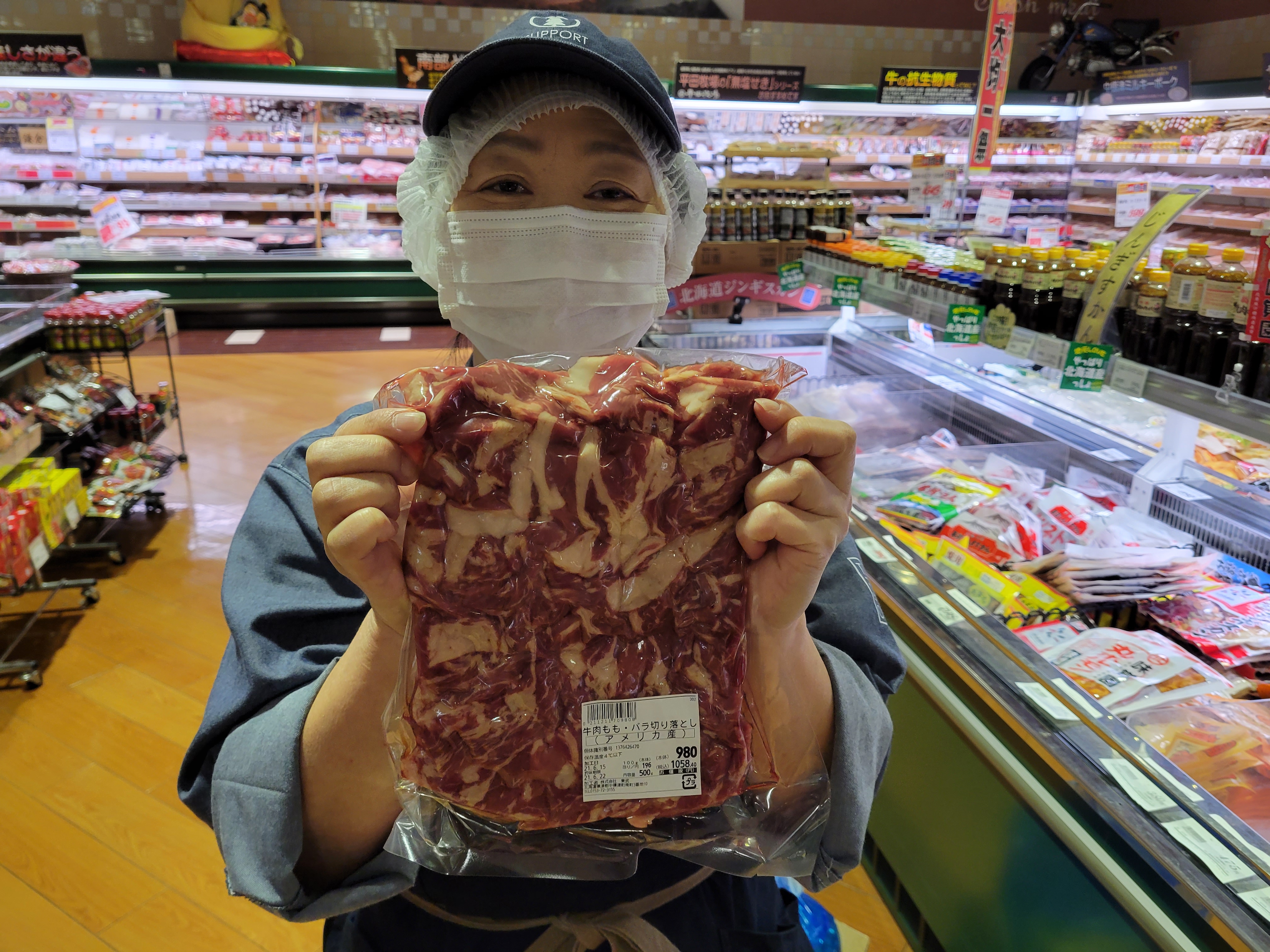本日ミート担当、宮崎さんのおすすめはノントレー牛肉がイチオシです😄料理用途が豊富で、すき焼き牛丼、炒め物などにご利用下さい真空パックですので、空気に触れると肉色が、元に戻ります🎵国産牛切り落としが均一特価の300g599円で販売中、、