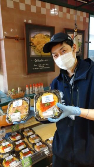 おはようございます。お惣菜コーナーでは父の日限定どんぶりを販売中。マグロ丼やかにえんがわ丼、かにしらす丼、いくら丼など多数取り揃えております。父の日に、お父さんと一緒にいかがでしょうか。是非ご利用ください。