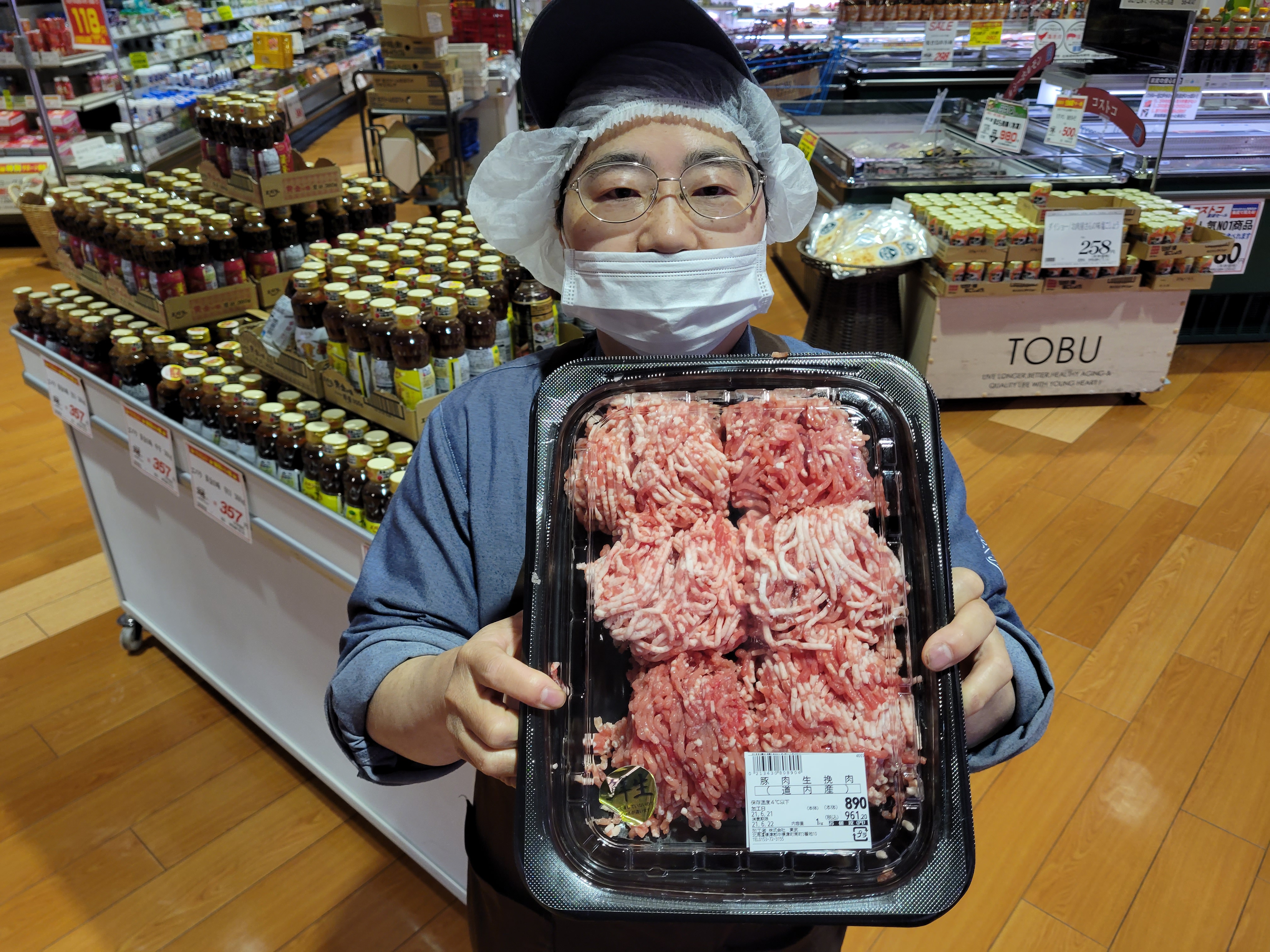 本日ミート担当、向山さんのイチオシ商品は、お徳用豚ひき肉がおすすめです🎵、餃子、ハンバーグ炒め物など、料理用途が豊富です本日限定で1kg890円で販売中