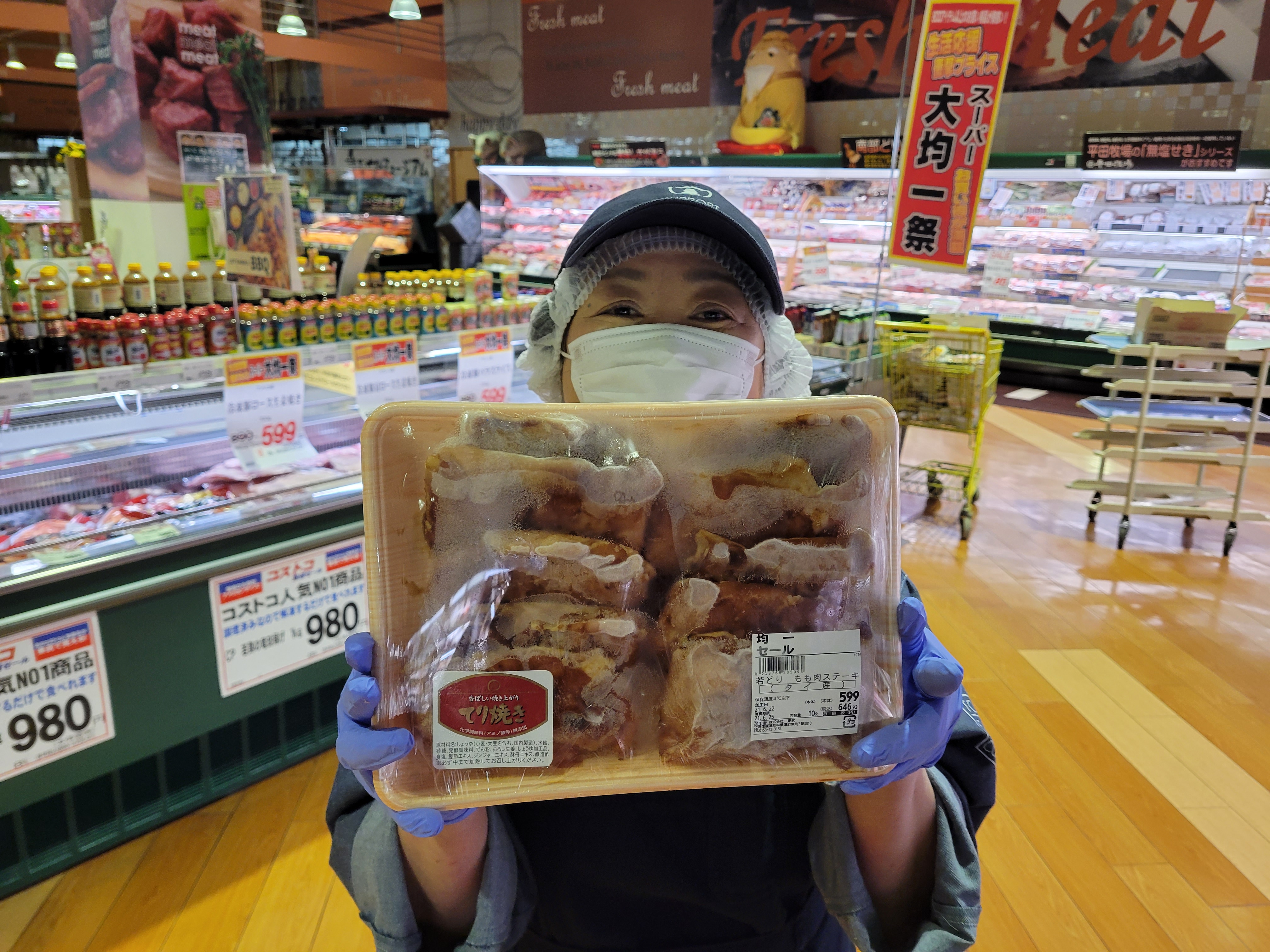 本日ミート担当、宮崎さんのおすすめは、照り焼きチキンがイチオシです🎵、通常価格10枚990円品が10枚の599円の均一特価で販売中ご利用下さいね😄フライパンで焼くだけの簡単調理、、、