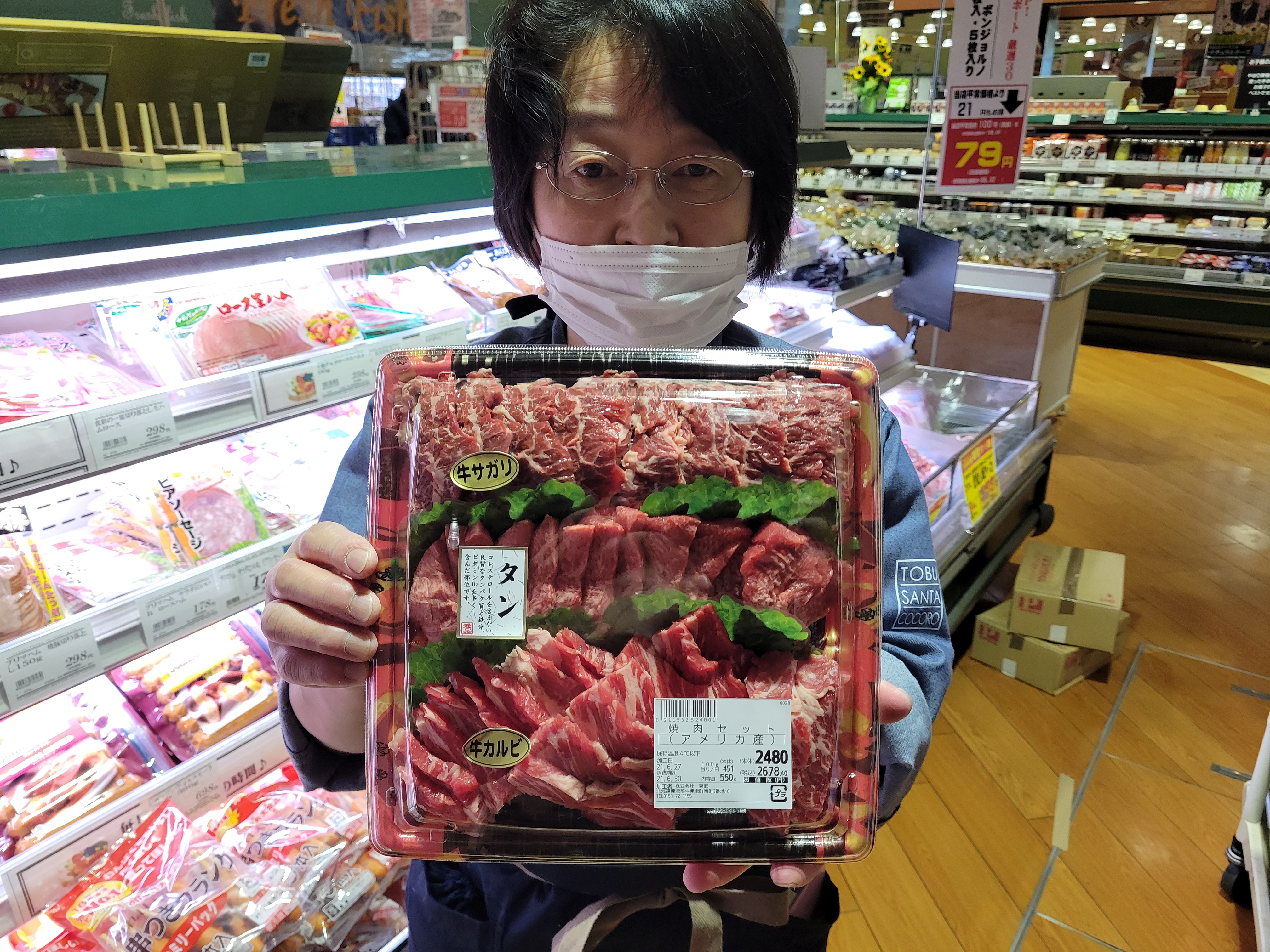 本日ミート担当、平間さんのおすすめは焼肉セットがイチオシです🎵人気の特上カルビ生ハラミ、特上タンのセットで3人前約550g2480円で販売中ご利用下さい。😄