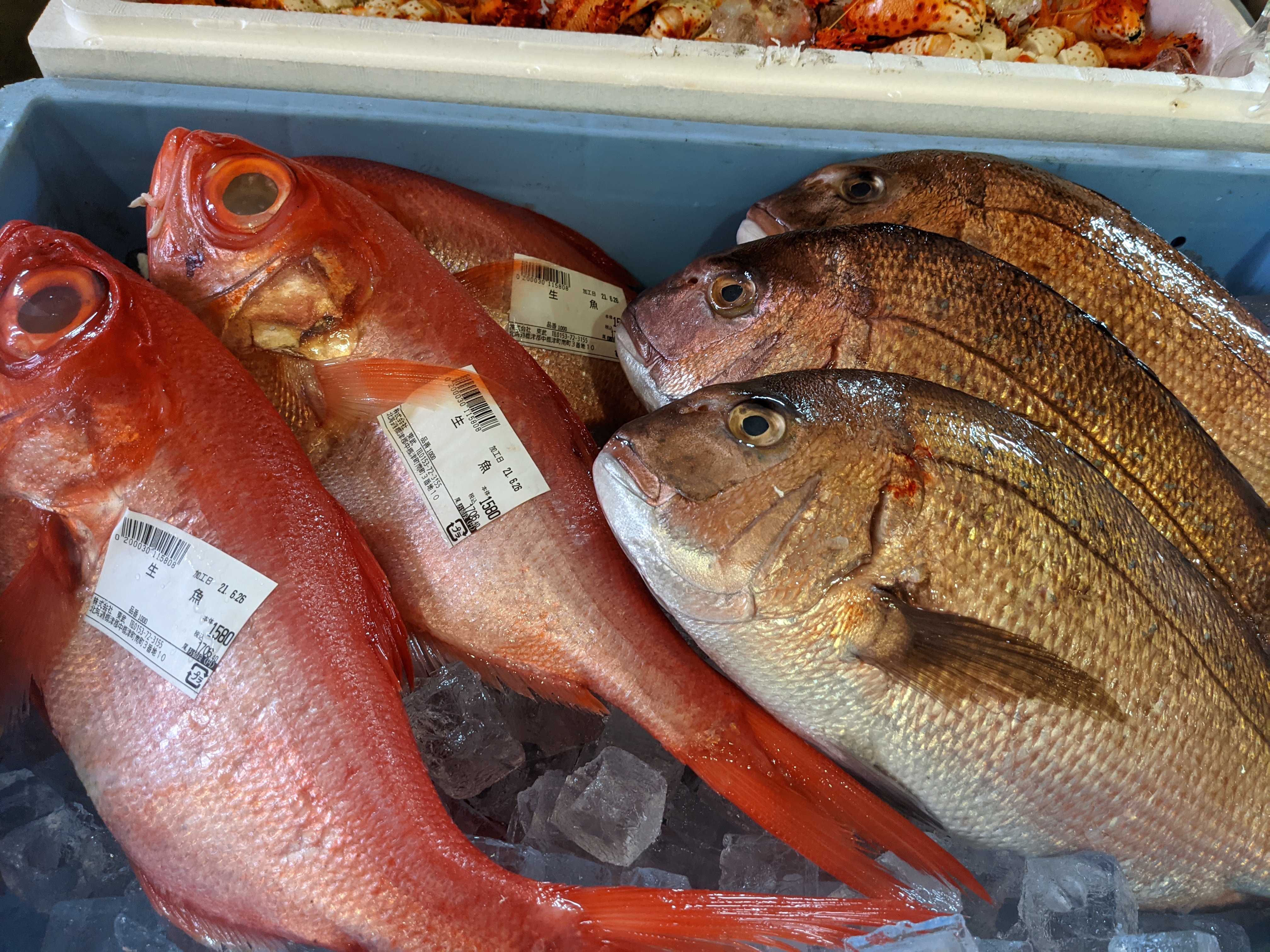 鮮魚コーナー本日は真鯛と金目鯛を販売中!調理も致しますので食べ比べなんていかがでしょうか?