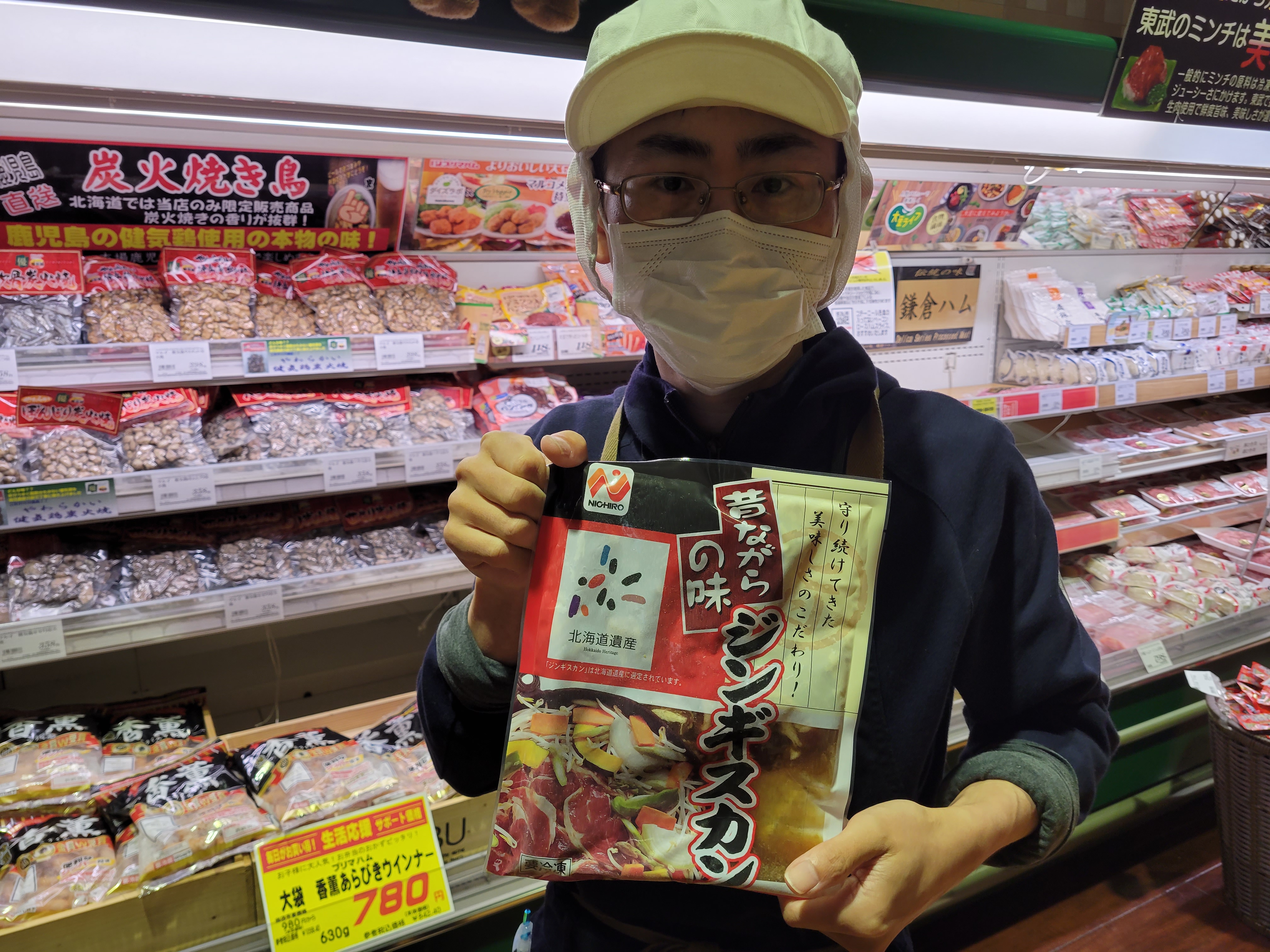 本日ミート担当、小平さんのおすすめは昔ながらのジンギスカンがイチオシです競合店に対抗して本日限定でお買得通常価格798円で販売している商品を450g495円にて販売しております、数に限りがございますのでお早めご利用下さいね😄