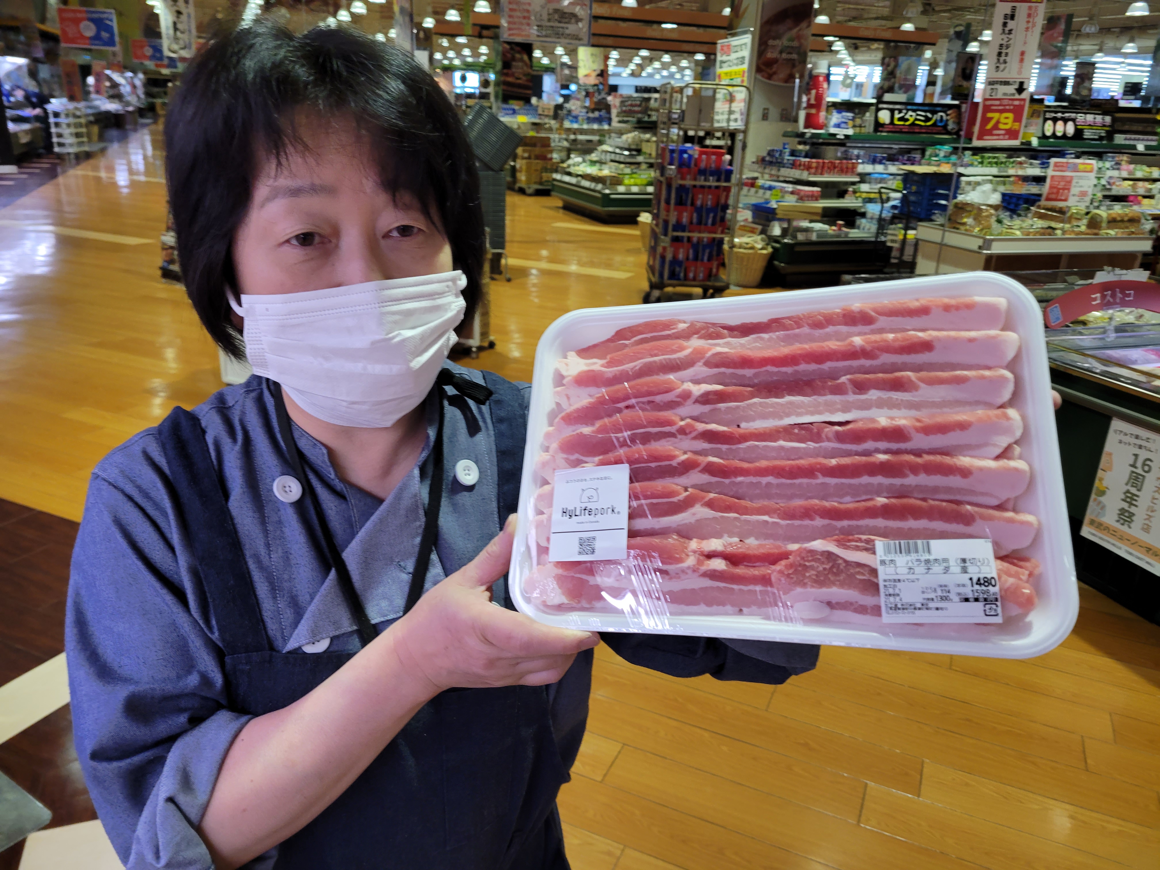本日ミート担当、平間さんのおすすめは、コストコ風豚肉バラBBQがイチオシです🎵厚切りカットで、BBQに最適カットして豚串にしても良いBBQカット1.3kgで1480円で販売中