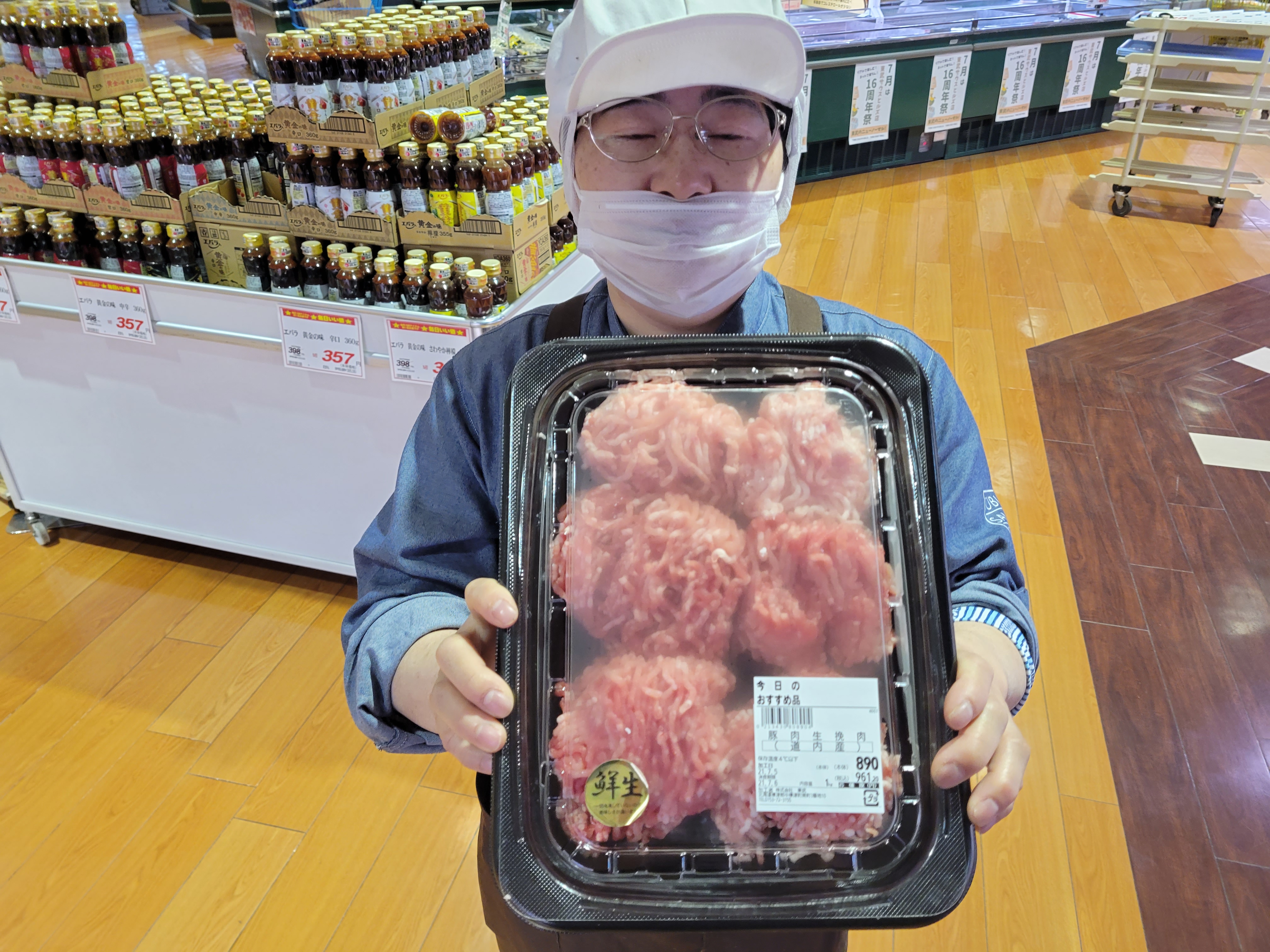 本日ミート担当、向山さんのおすすめは、メガ盛りひき肉がイチオシです🎵月曜日限定でお買得、料理用途も豊富で、餃子ハンバーグ、炒め物に最適です1キロ入って890円で販売中小分けして冷凍保存、経済的です