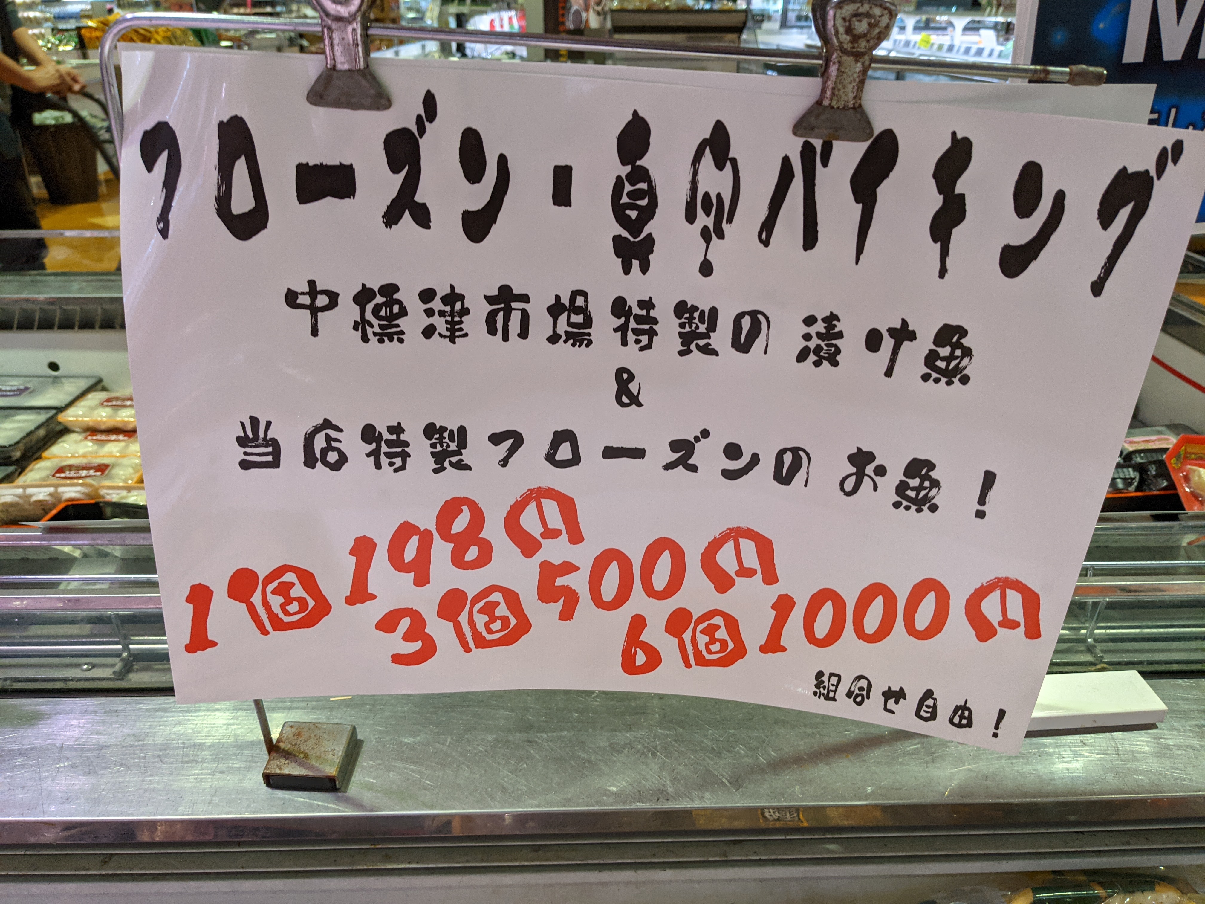 鮮魚コーナーでは周年祭企画といたしまして、フローズンバイキングをおこなっていますよ!種類も豊富にございますので是非ご利用ください!