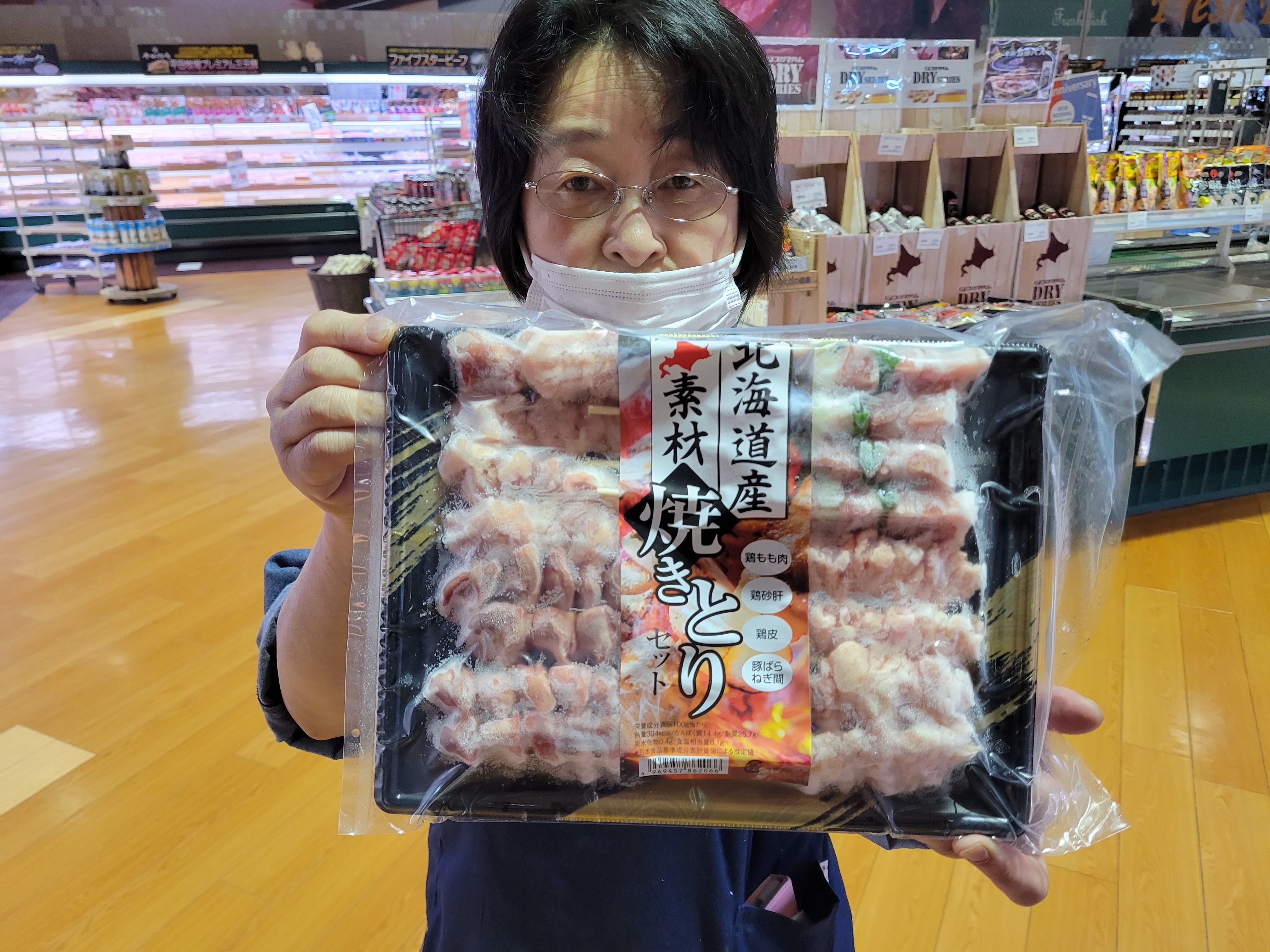 本日ミート担当、平間さんのおすすめは焼鳥セットがイチオシです🎵北海道産原料使用で、鶏もも、砂肝鶏かわ、豚バラの4種類16本入りで1250円で販売中です😄ご利用下さいね✨