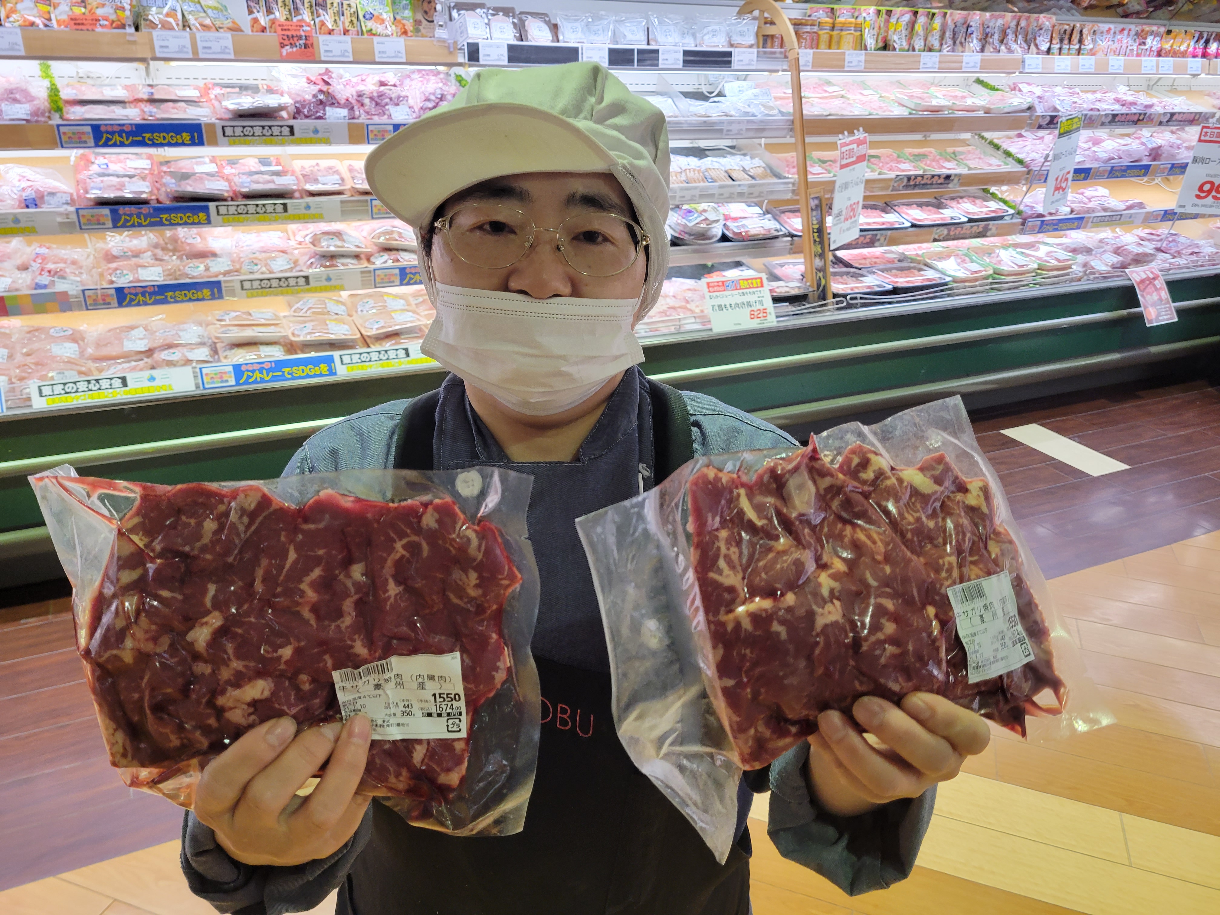 本日ミート担当、向山さんのおすすめは、手切り焼肉、牛ハラミがイチオシです🎵厚切りカットで柔らかい、味が濃くBBQに最適です😄真空パックで日持ちも良い350g1550円で販売ですご利用下さいね✨