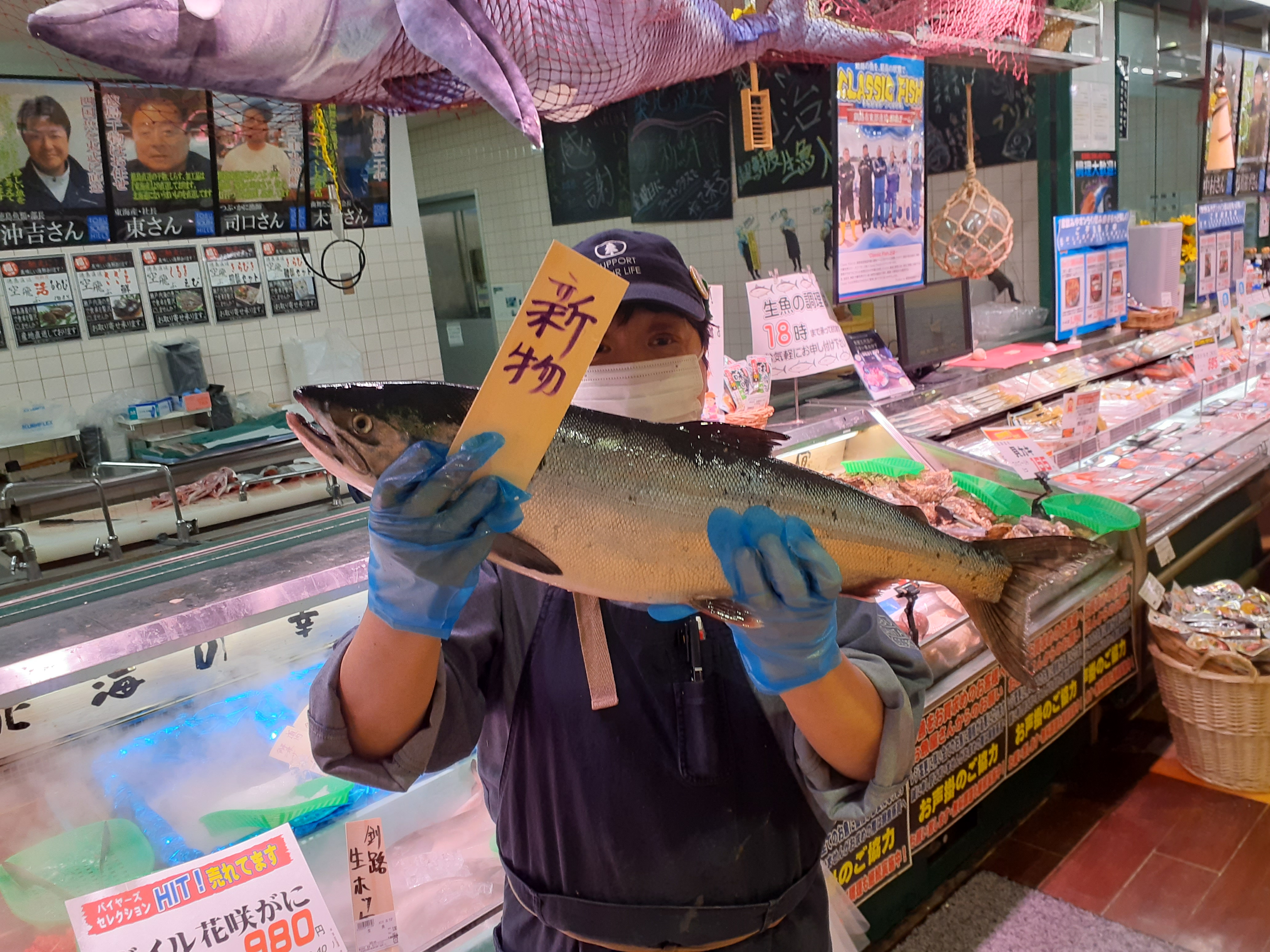 おはようございます。本日はお初になります。道内産 秋鮭の登場です。1尾だけの貴重秋鮭 お値段3980円です。是非とも鮮魚コーナーでお待ちしております。