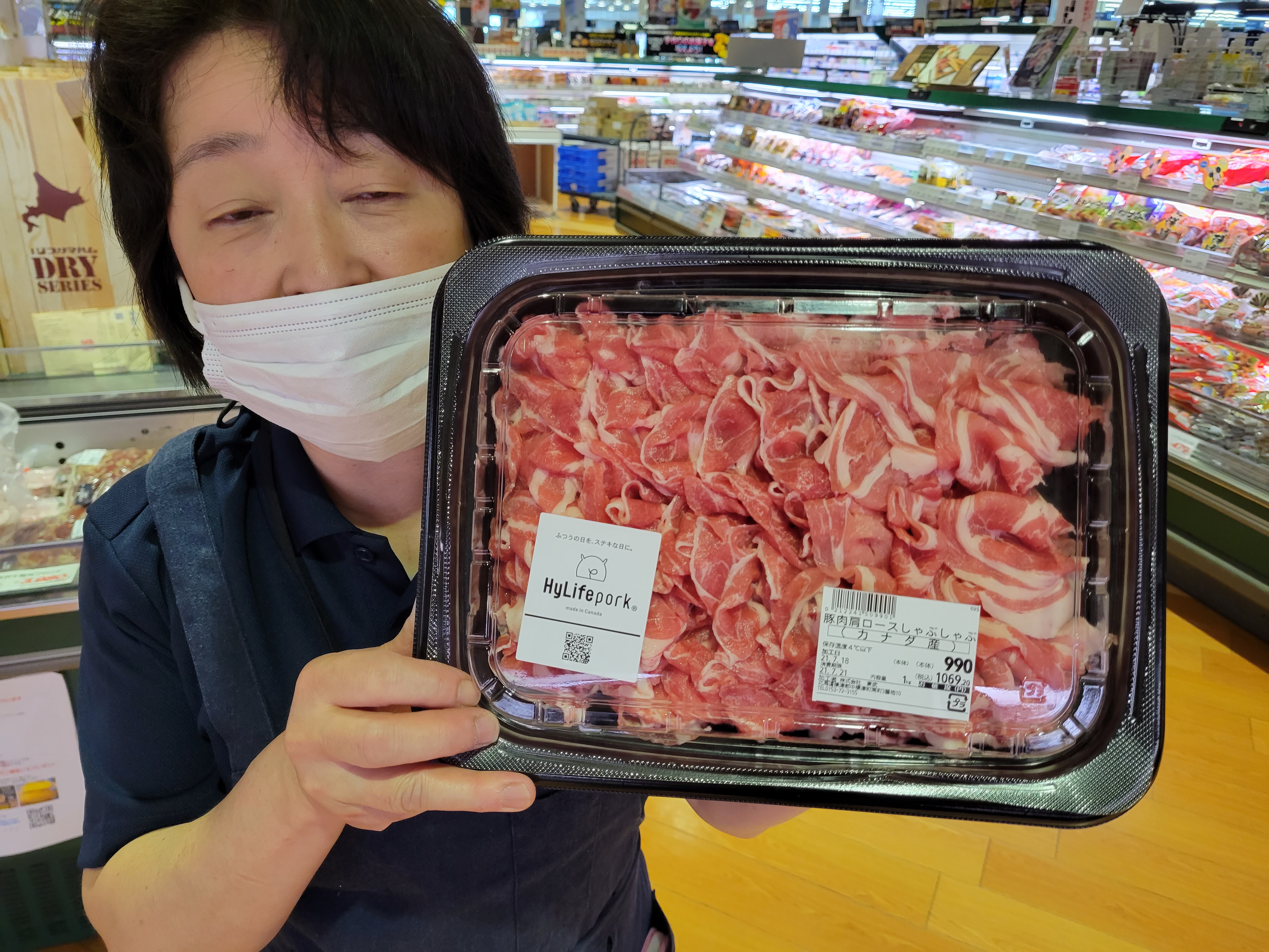 本日ミート担当、平間さんのおすすめは、カナダ産ハイライフポークの豚肉肩ロースしゃぶしゃぶがイチオシです国産豚肉に匹敵する美味しさ夏野菜と一緒にサラダご利用下さいね🎵