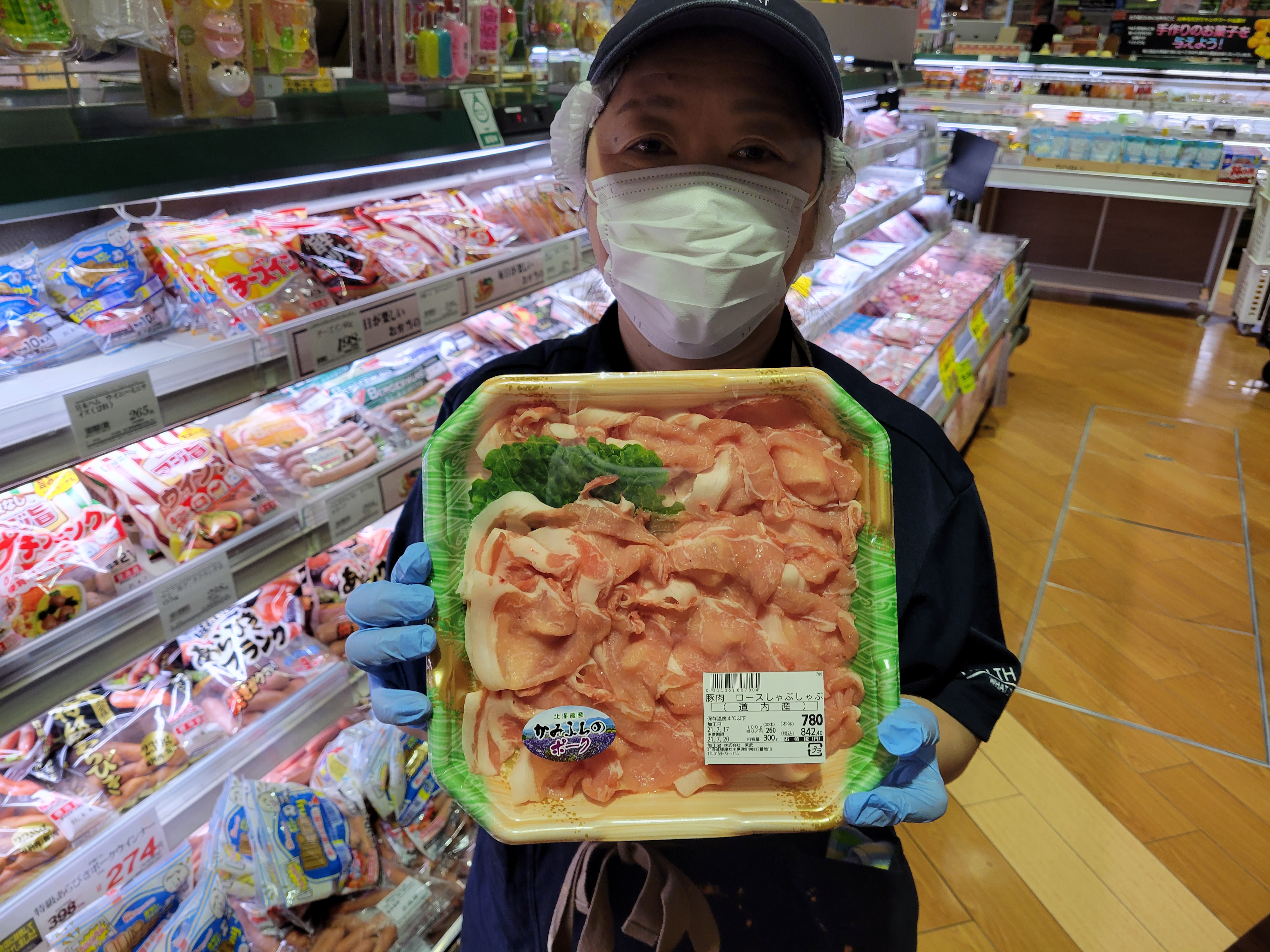 本日ミート担当、宮城さんのおすすめは冷しゃぶしゃぶ用がイチオシです😄暑い日には、お野菜もたっぷり取れる冷しゃぶしゃぶでビタミンB2も豊富冷やし中華にも最適です🎵本日は競合店に対抗して100g当たり95円にて販売中