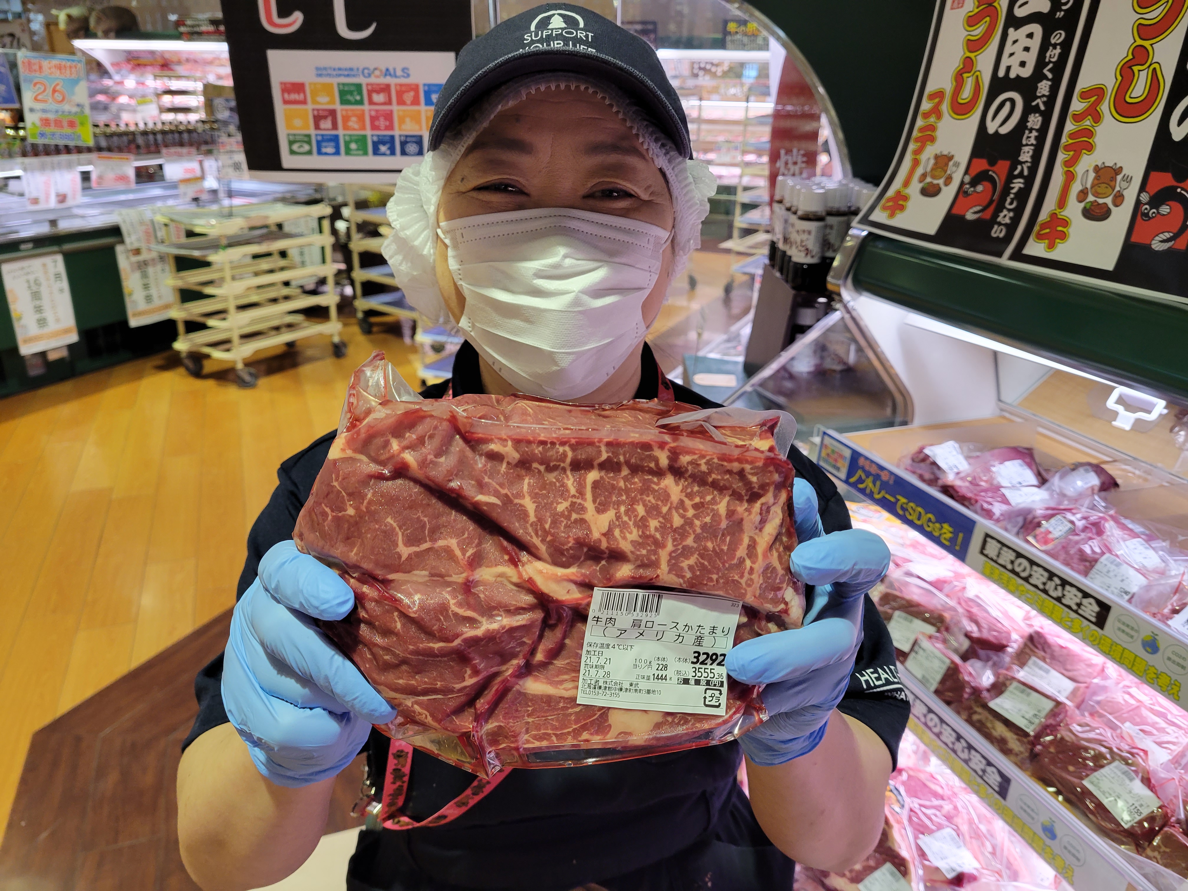 本日ミート担当、宮城さんのおすすめはコストコ風の牛固まり肉がイチオシです牛肉バラブロック、牛カルビブロック牛ハラミブロック、サーロイン、肩ロース、豚肉ロースなど真空包装で日持ちもする22日~24日までお買得特価ですご利用下さい。😄