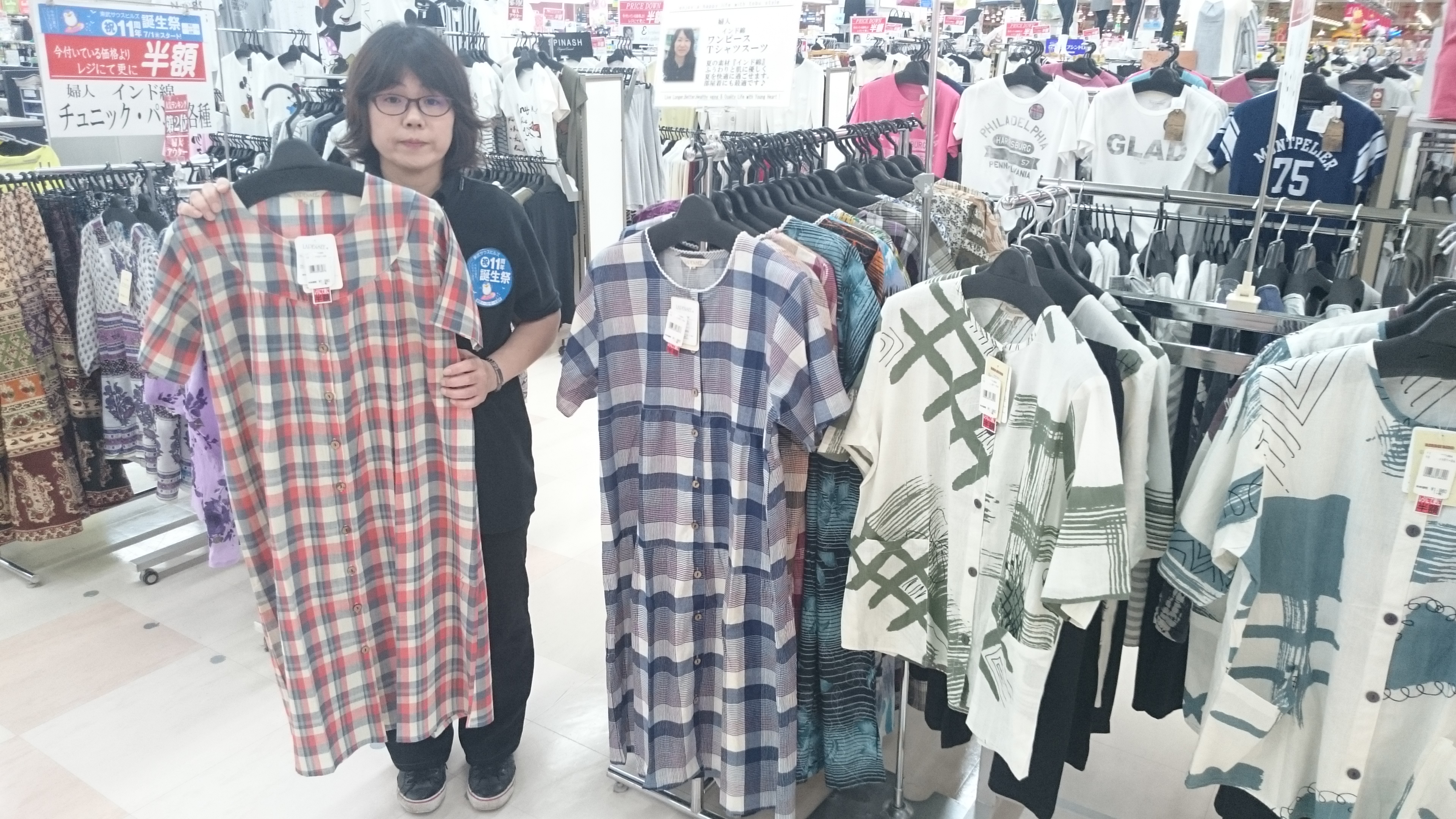 おはよーございます今日も暑いです!もう家でも涼しく過ごすには インド綿素材のワンピースです!夏のイチオシ素材インド綿はさらさら素材で着心地も涼しく最適です。今なら夏物セールで半額とお買い得!是非 夏物はまとめ買いを!