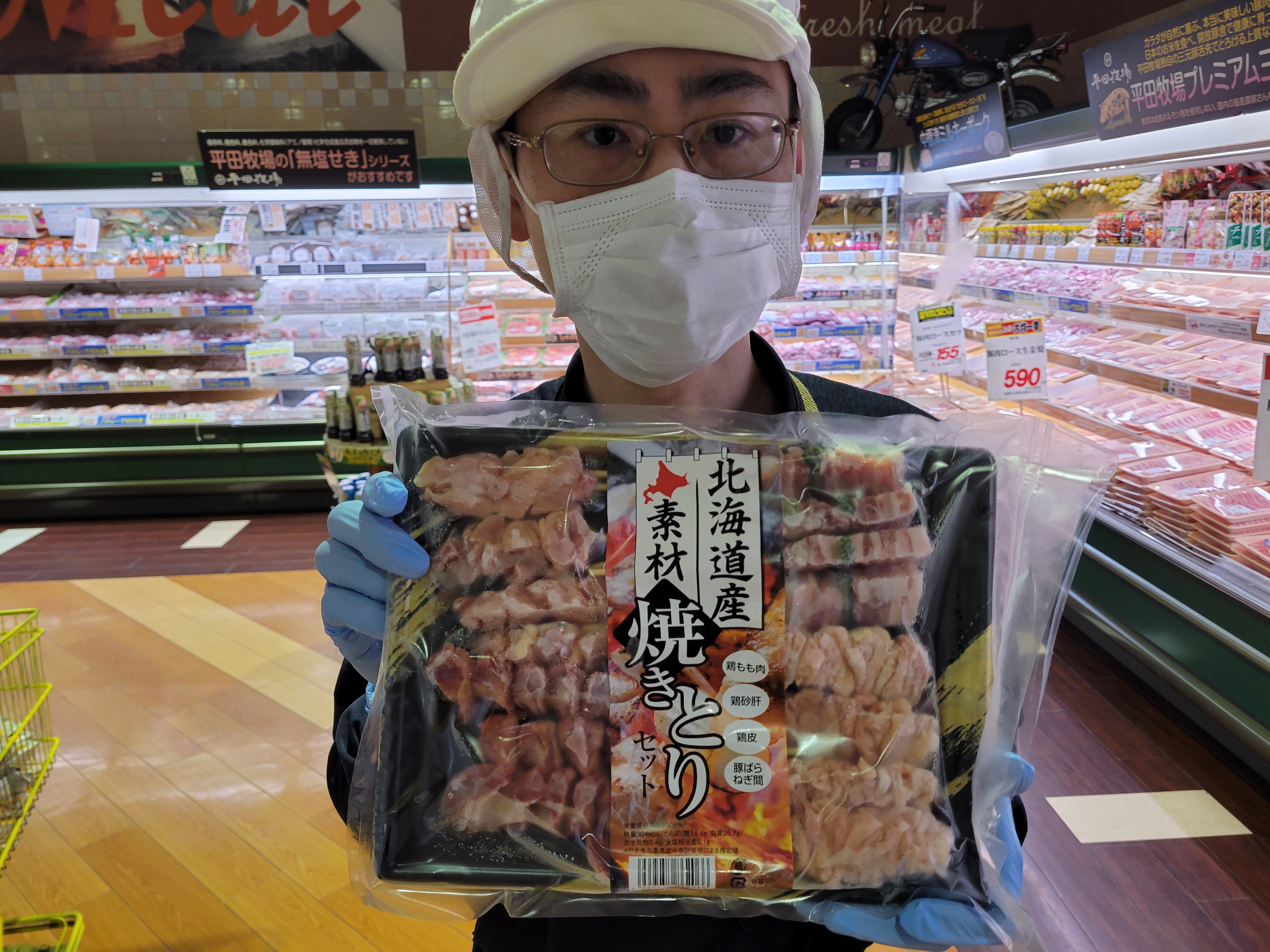 本日ミート担当、小平さんのおすすめは北海道産素材の焼とりセットがイチオシです🎵、鶏もも、鶏砂肝鶏皮、豚バラネギ間のセットで16本1250円で販売中です😄ご利用下さいね🎵