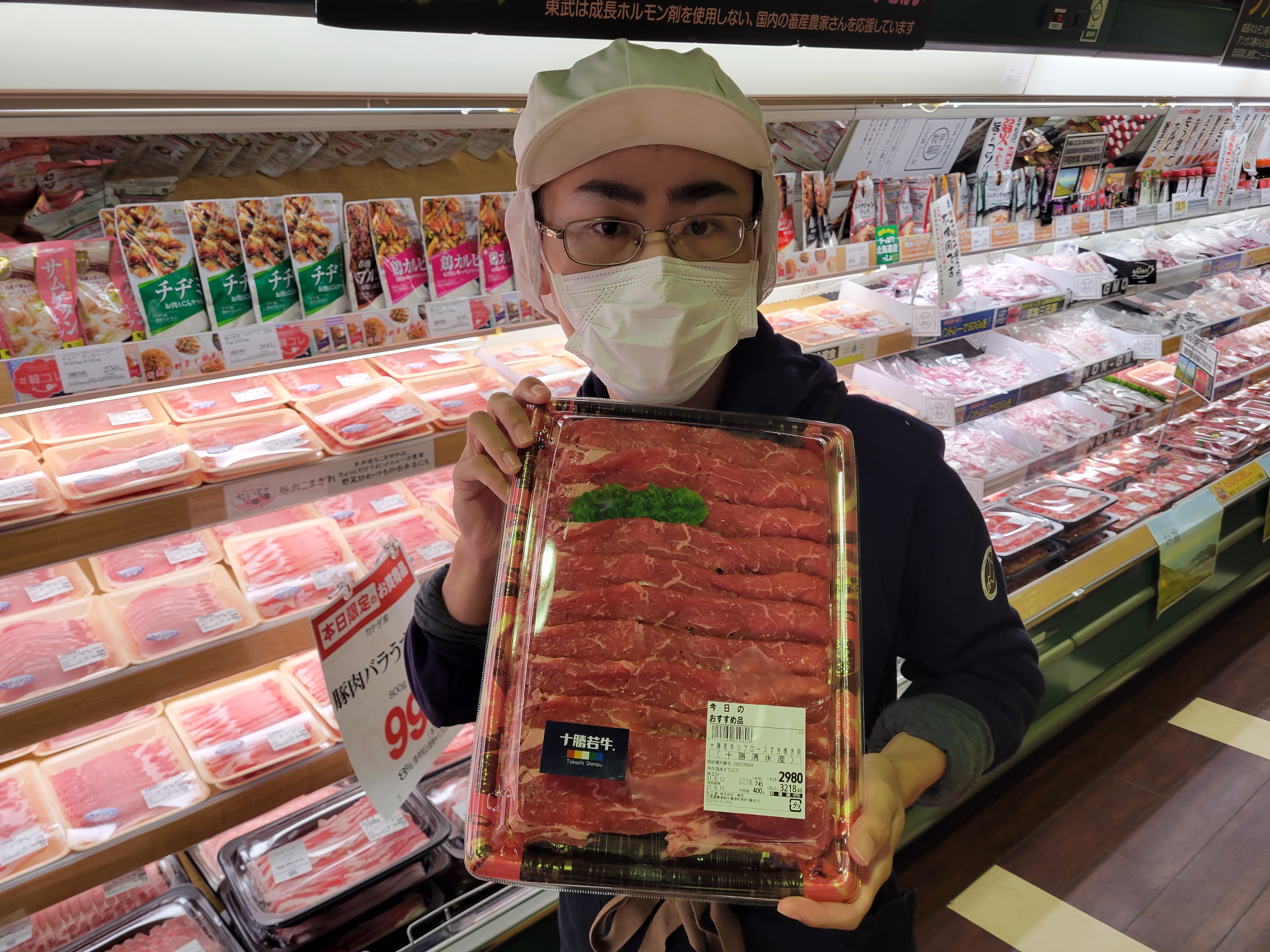 本日ミート担当、小平さんのイチオシ十勝若牛のロースすき焼きがおすすめです😄産地直送で肥育日数が短く柔らかいお肉です🎵家族が揃うお盆、焼肉の次は、すき焼きで、4人前約400g2980円で販売中、ご利用下さいね🎵
