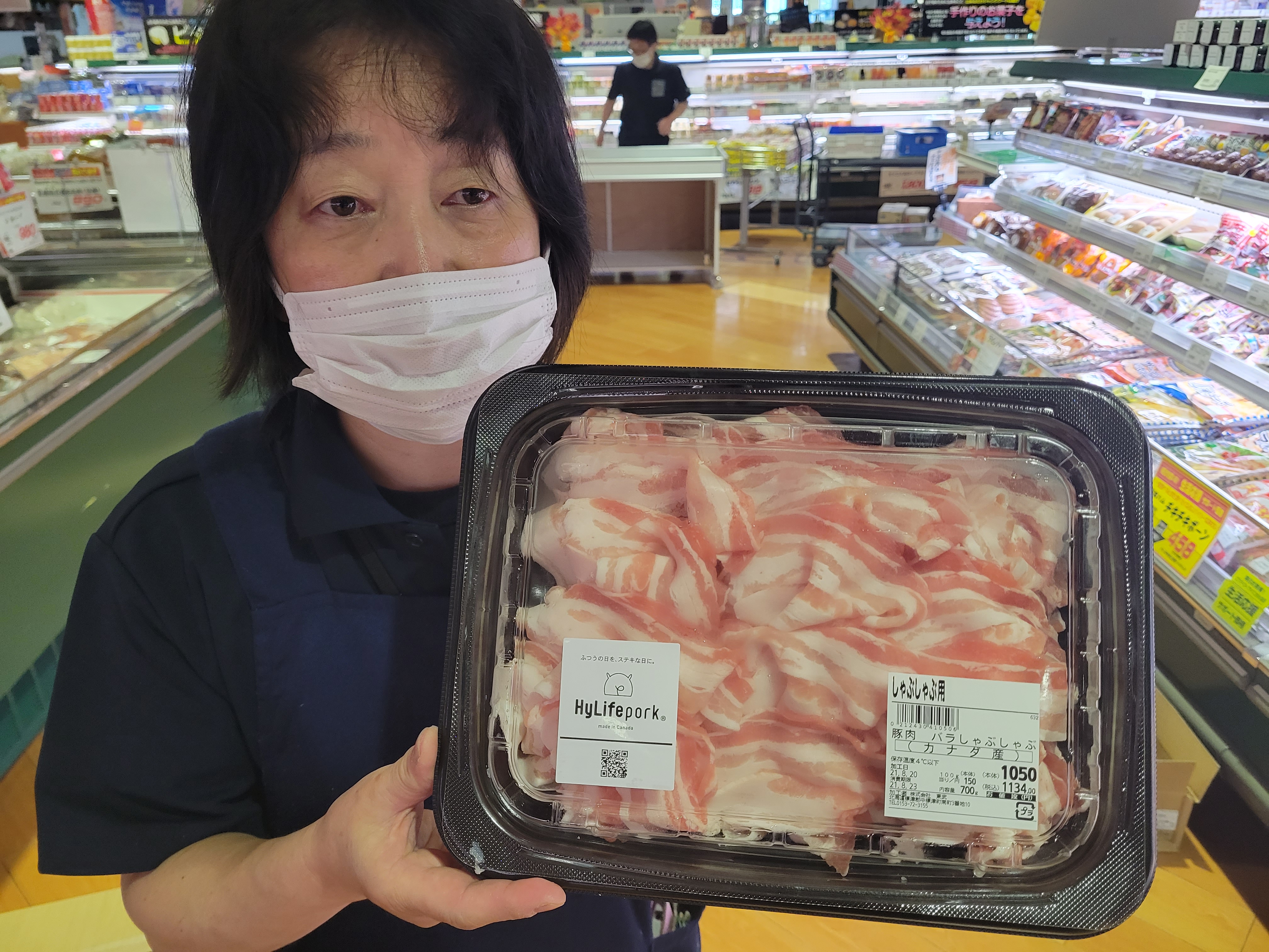 本日ミート担当、平間さんのおすすめは、メガ盛り豚しゃぶしゃぶしゃぶがイチオシです🎵このボリュームで約5人前700g1050円で販売中しゃぶしゃぶ、サラダ、炒め物など料理用途も豊富です、ご利用下さいね😄