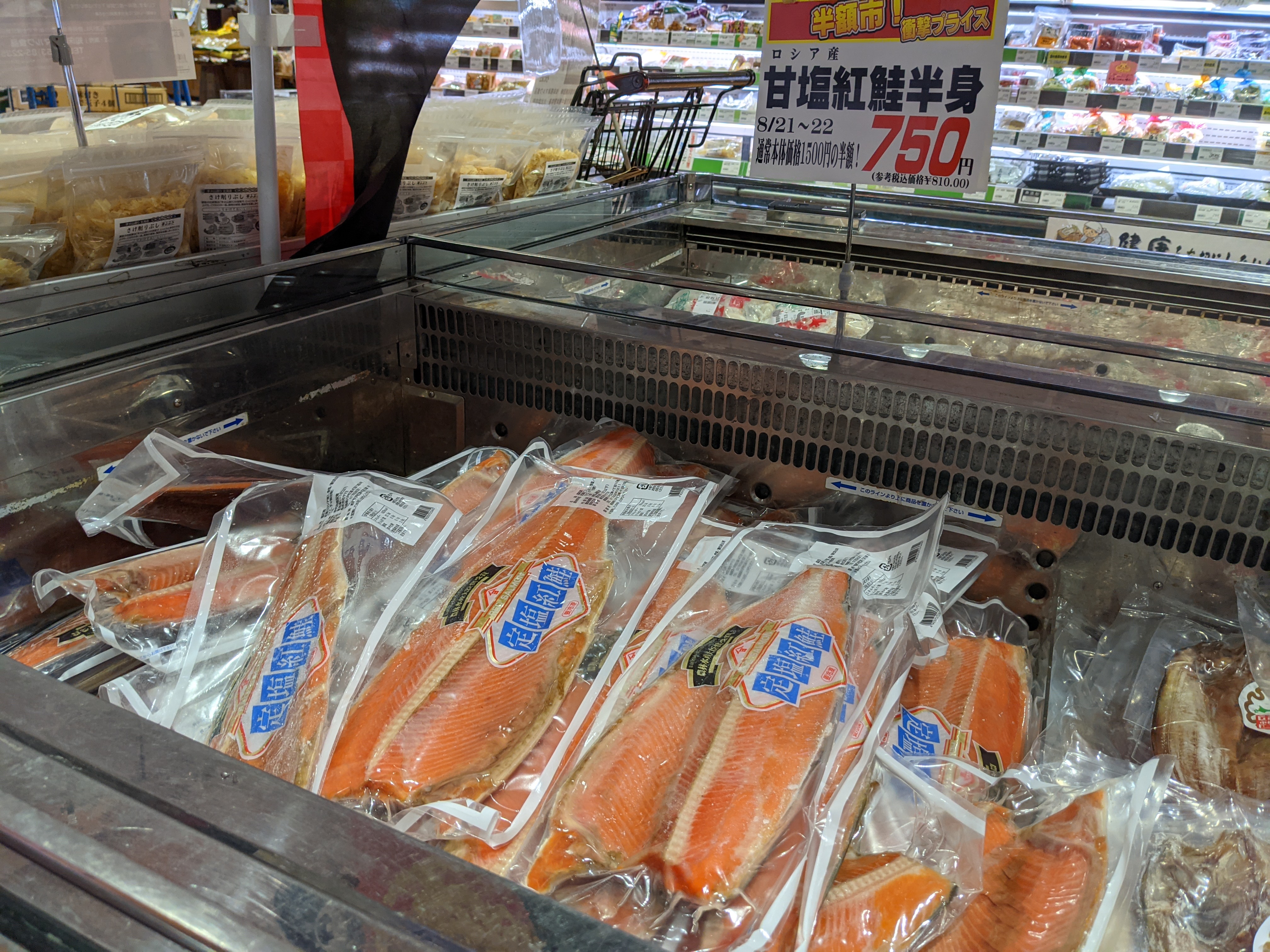 本日は半額市開催中!紅鮭の半身が750円と超特価で販売中でございます!今日までなのでお忘れなく!