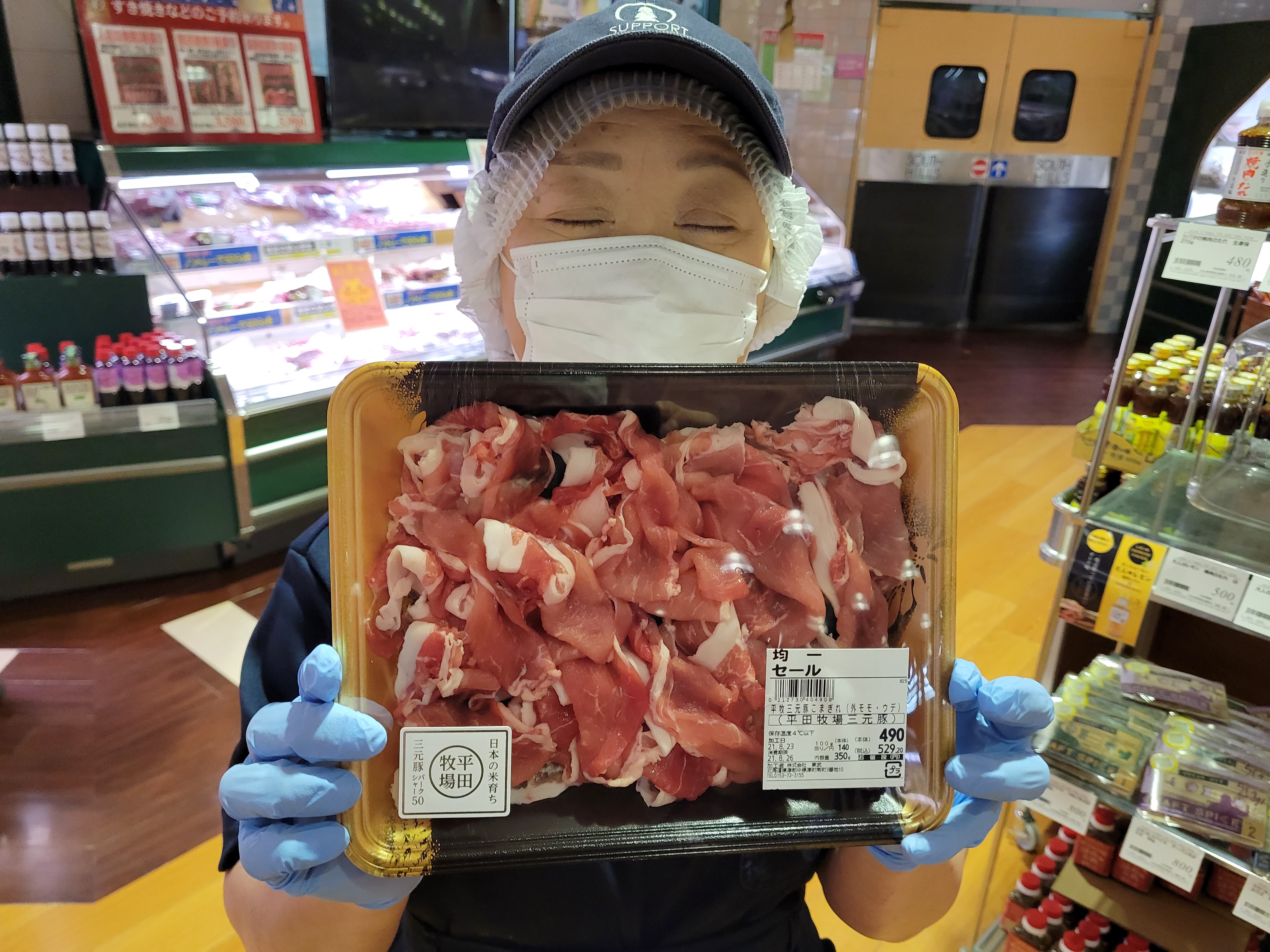 本日ミート担当、宮崎さんのおすすめは平田牧場、三元豚の小間切れがイチオシです😄黒豚のバークシャー種を交配させたひと味も2味も違う特別の品種です本日限定で均一特価の350g490円で販売中、ご利用下さいね😄