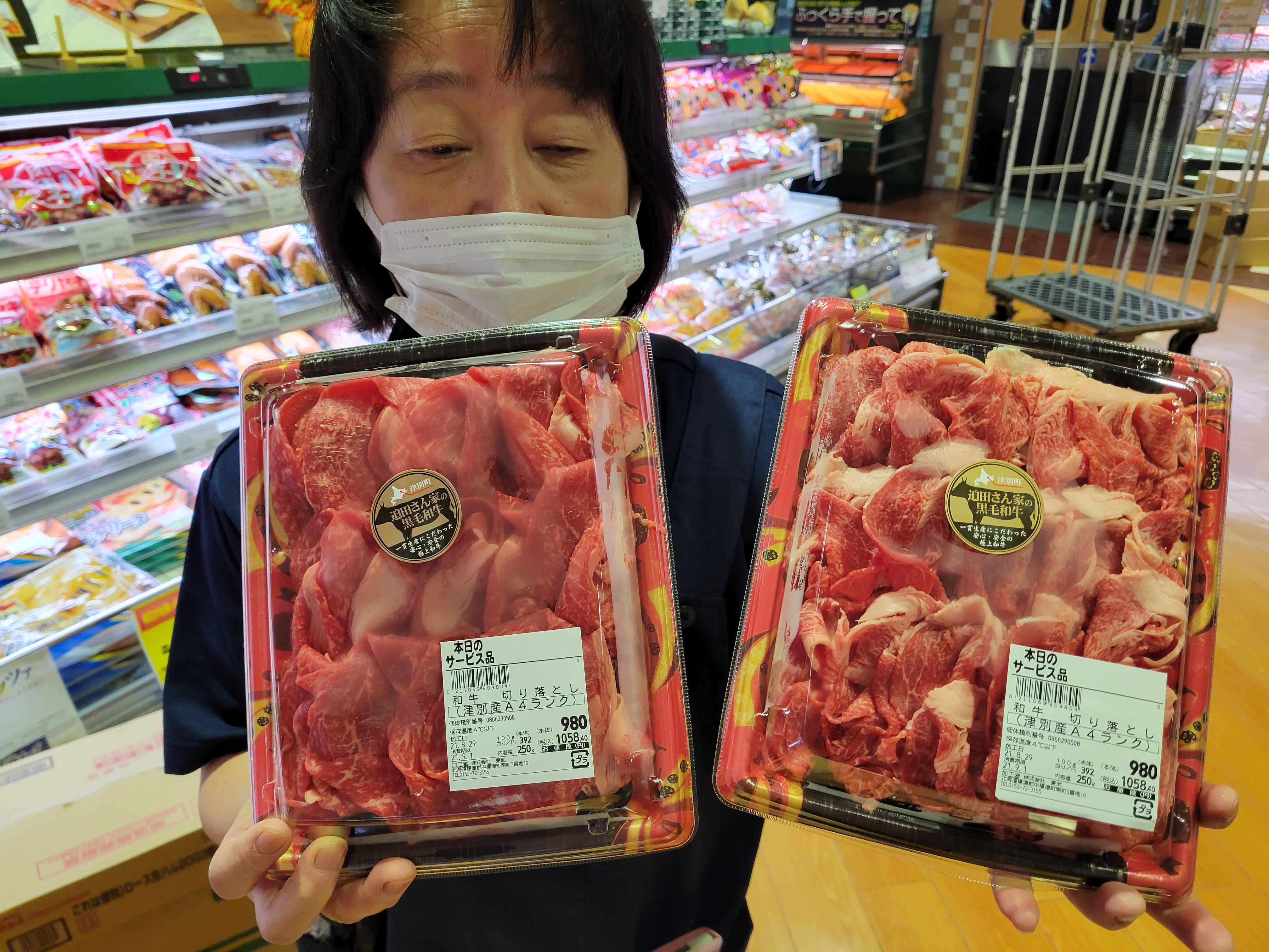 本日ミート担当、平間さんのおすすめ迫田さん家の津別牛切り落としがイチオシです🎵格付け等級A4ランク一貫生産にこだわった、安心安全の極上和牛です😄250g980円で販売中、ご利用下さいね