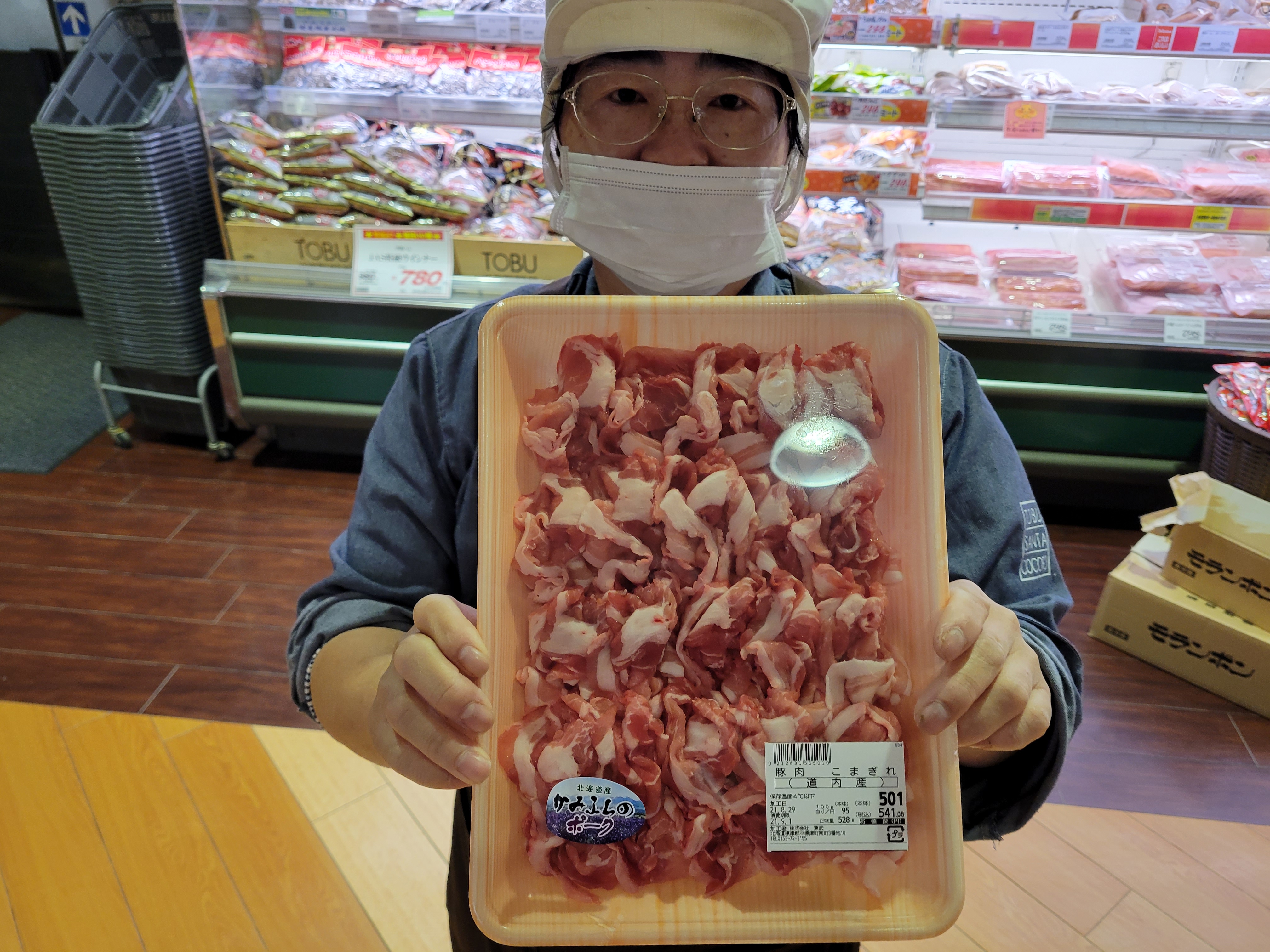本日ミート担当、向山さんのおすすめは、かみふらのポーク切り落としがイチオシです🎵産地直送の豚肉で動物性飼料は使わず植物性飼料主体で肥育しておりますので臭みも少なく美味しいです本日は料理用途が豊富な切り落としが競合店対抗価格の100g当たり95円で販売中です、ご利用下さいね😄
