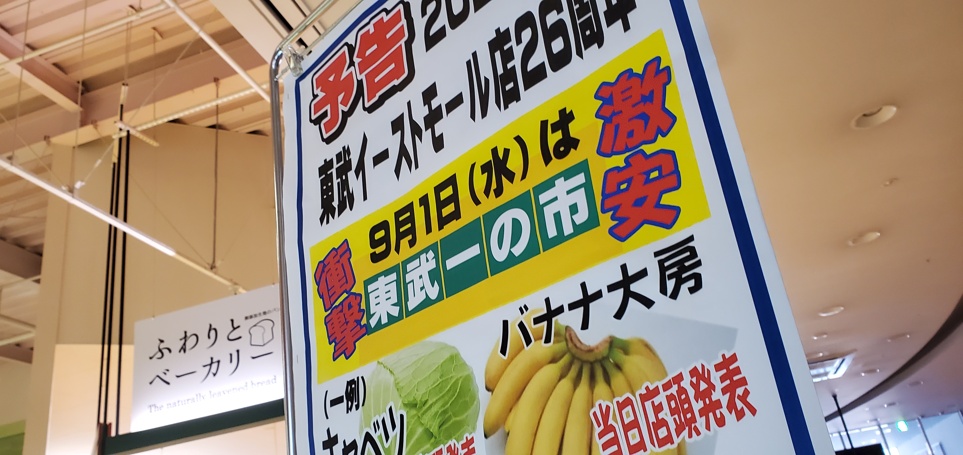 明日から9月に入ります。明日から1ヶ月は東武端野イーストモールの誕生際が始まります。最初は恒例一の市です。青果からキャベツやとうもろこし、バナナなどお買得なのでぜひ、ご利用お待ちしております。(^-^)