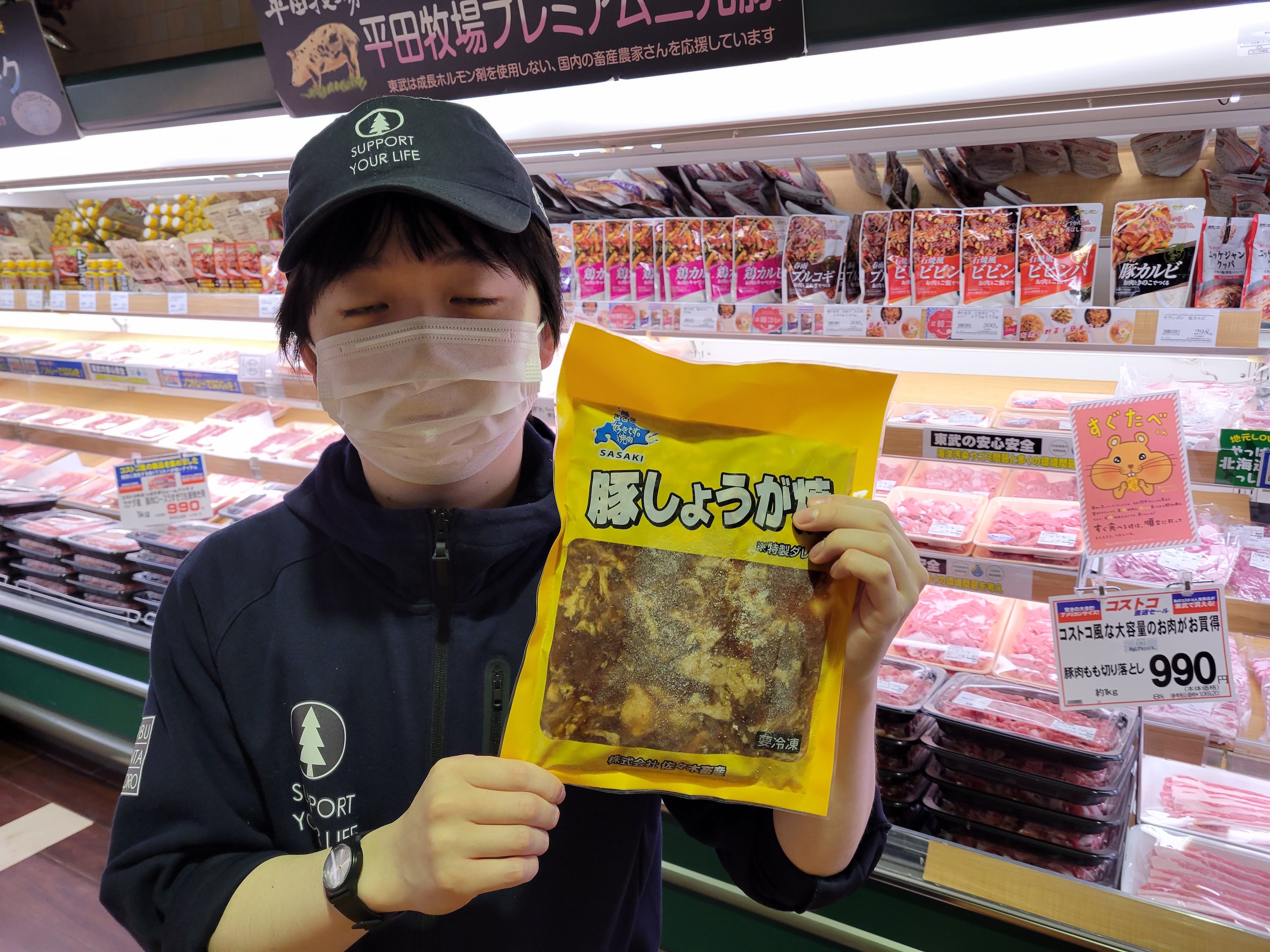本日ミート担当、室井さんのイチオシ佐々木畜産自家製の特製タレで作った豚生姜焼きがおすすめです🎵東武周年で特別にお安くして頂きました✨500g398円で販売中ですご利用下さいね😄
