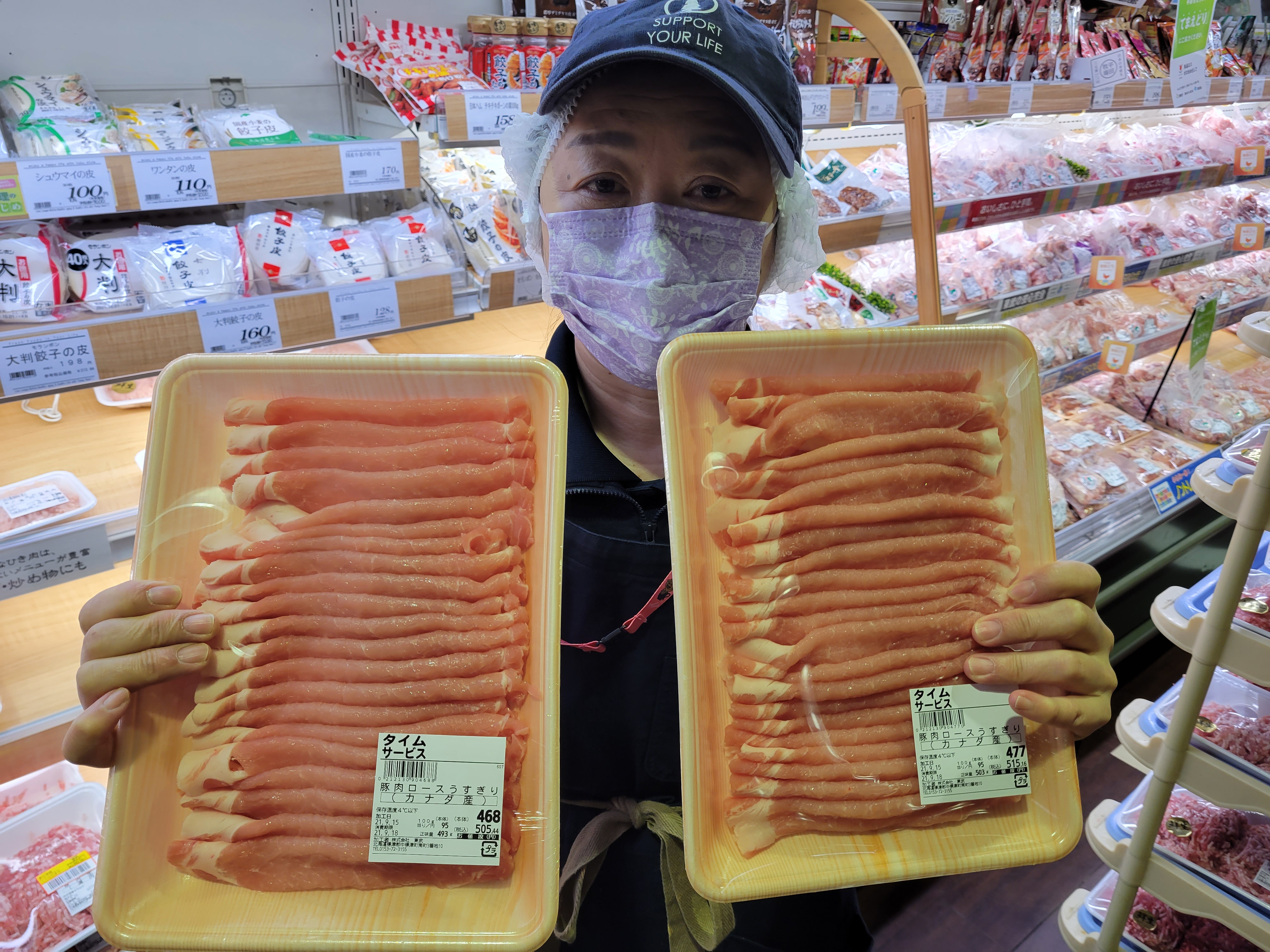 本日ミート担当、宮崎さんのおすすめカナダ産豚肉ロースがイチオシです国産豚肉に匹敵する美味しさすき焼き、焼肉、肉巻き、カツ用に競合店に対策して、100g当たり95円にて販売中ご利用下さいね🎵