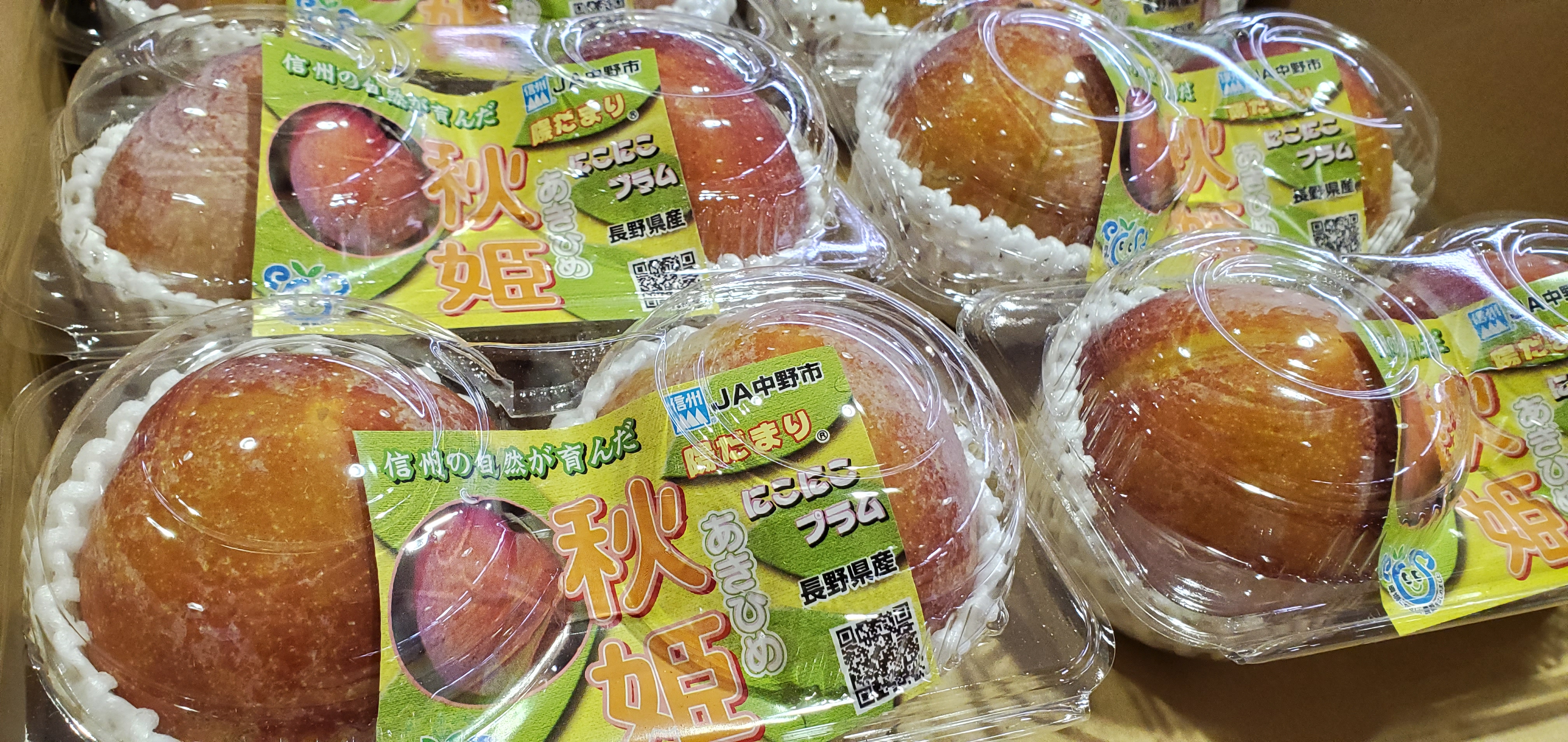 今日から販売の長野産秋姫プラム大玉2個入りパックは表面が赤っぽい果肉は、かためで黄色で甘味が強い濃厚な味わいが特徴。ぜひ、ご利用お待ちしております。しそう