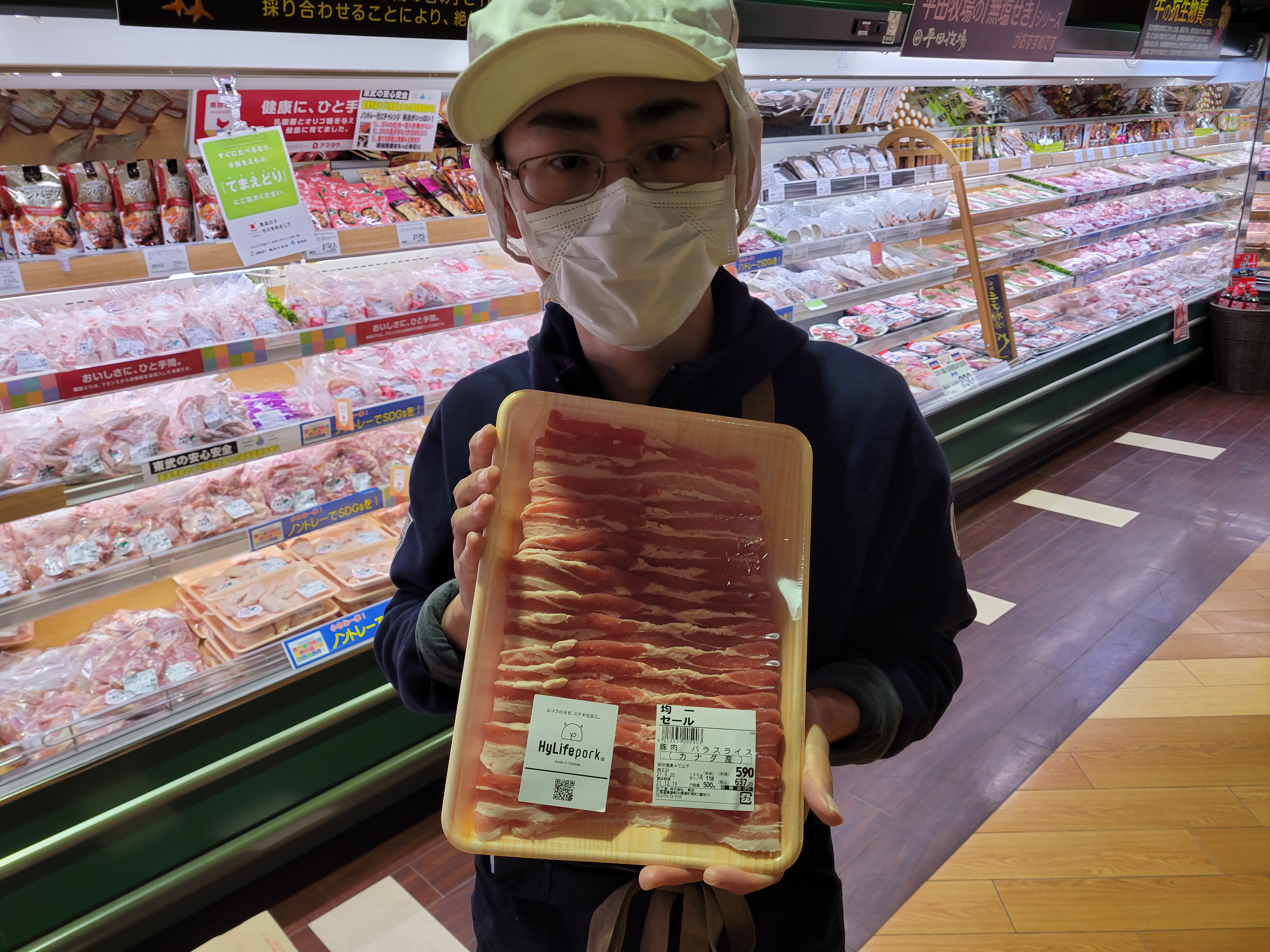 本日ミート担当、小平さんのおすすめカナダ産豚肉バラスライスがイチオシ料理用途が豊富なバラ肉肉じゃが、炒め物、キムチ鍋など国産豚肉に匹敵する美味しさカナダ産ハイライフポークご利用下さいね🎵