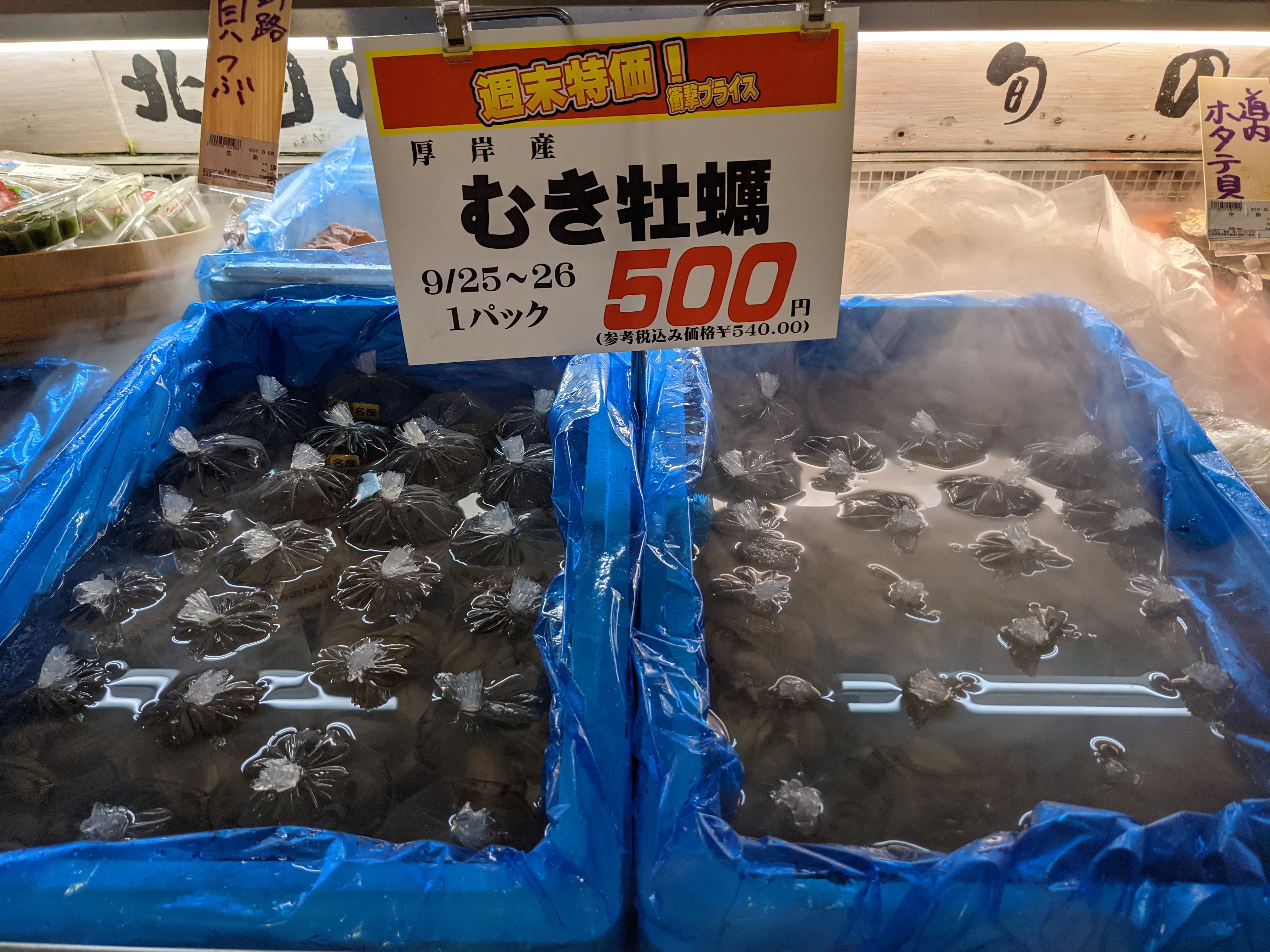 鮮魚コーナーではむきカキがお買い得ですよ!そのまま生でもお鍋に入れても美味しいです!是非ご利用くださいませ