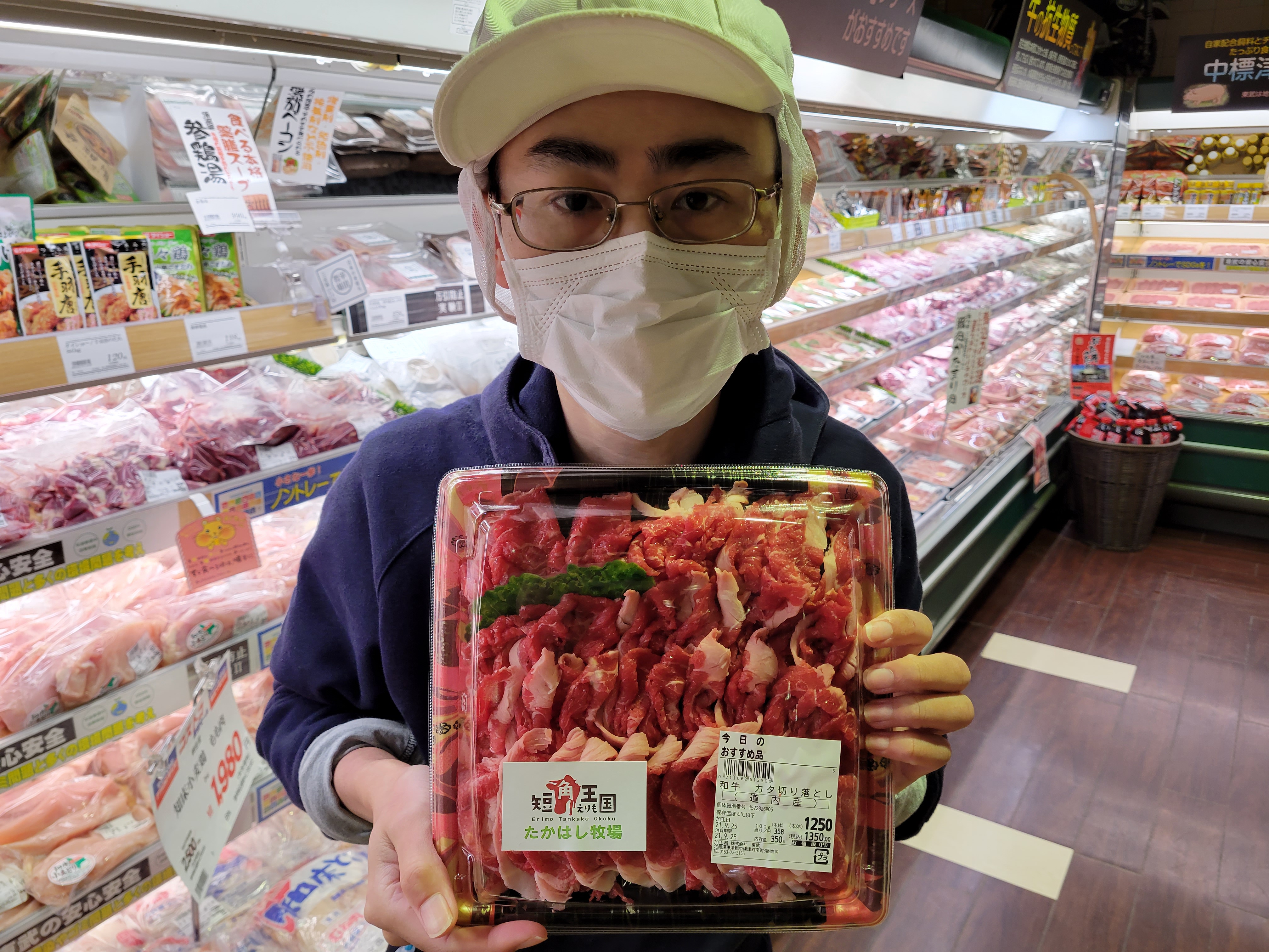 本日ミート担当、小平さんのイチオシは短角牛切り落としがおすすめ和牛の中でも1%しか肥育されてない赤身美味しい和牛です、すき焼き、牛肉丼、肉じゃがなど料理用途も豊富です🎵350g1250円で販売中ご利用下さいね😄