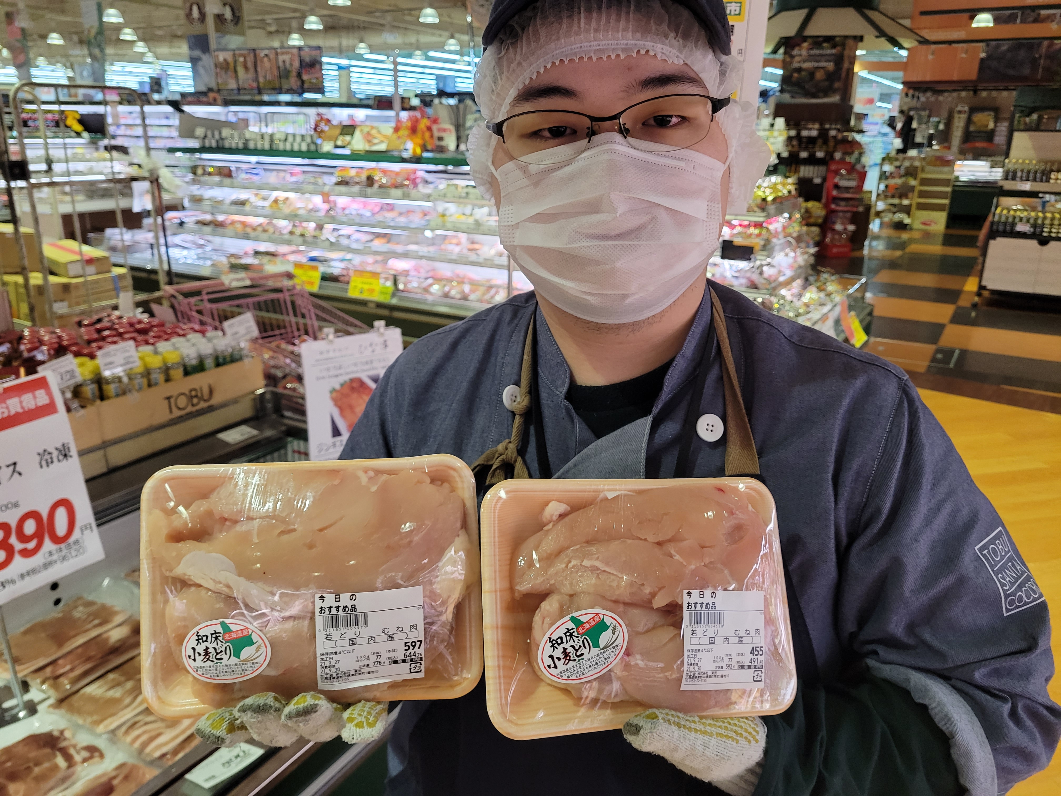 本日ミート担当、田中さんのおすすめ知床小麦どりがイチオシです🎵北海道産小麦を加えた独自の配合飼料で鶏臭みが少なく柔らかな、歯切れの良さが特長の鶏肉です😄本日は100g当たり77円の均一特価にて販売中です、ご利用下さいね🎵