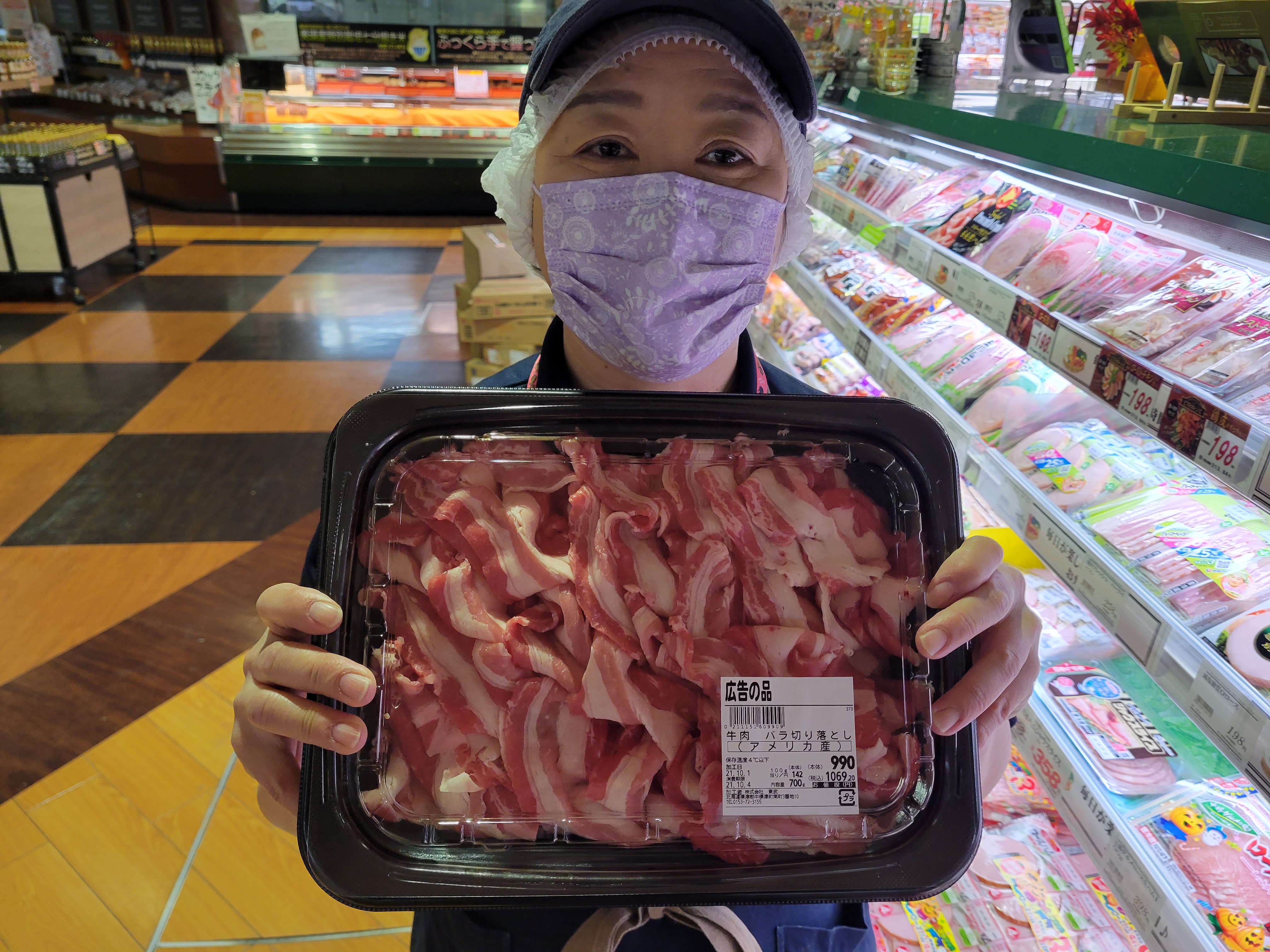 本日ミート担当、宮崎さんのおすすめお徳用牛肉バラ切り落としがイチオシこのボリュームで約5人前の牛丼が作れるサイズです、牛丼、野菜炒めハッシュドビーフなど、料理用途も豊富、700g990円で販売中ご利用下さいね🎵