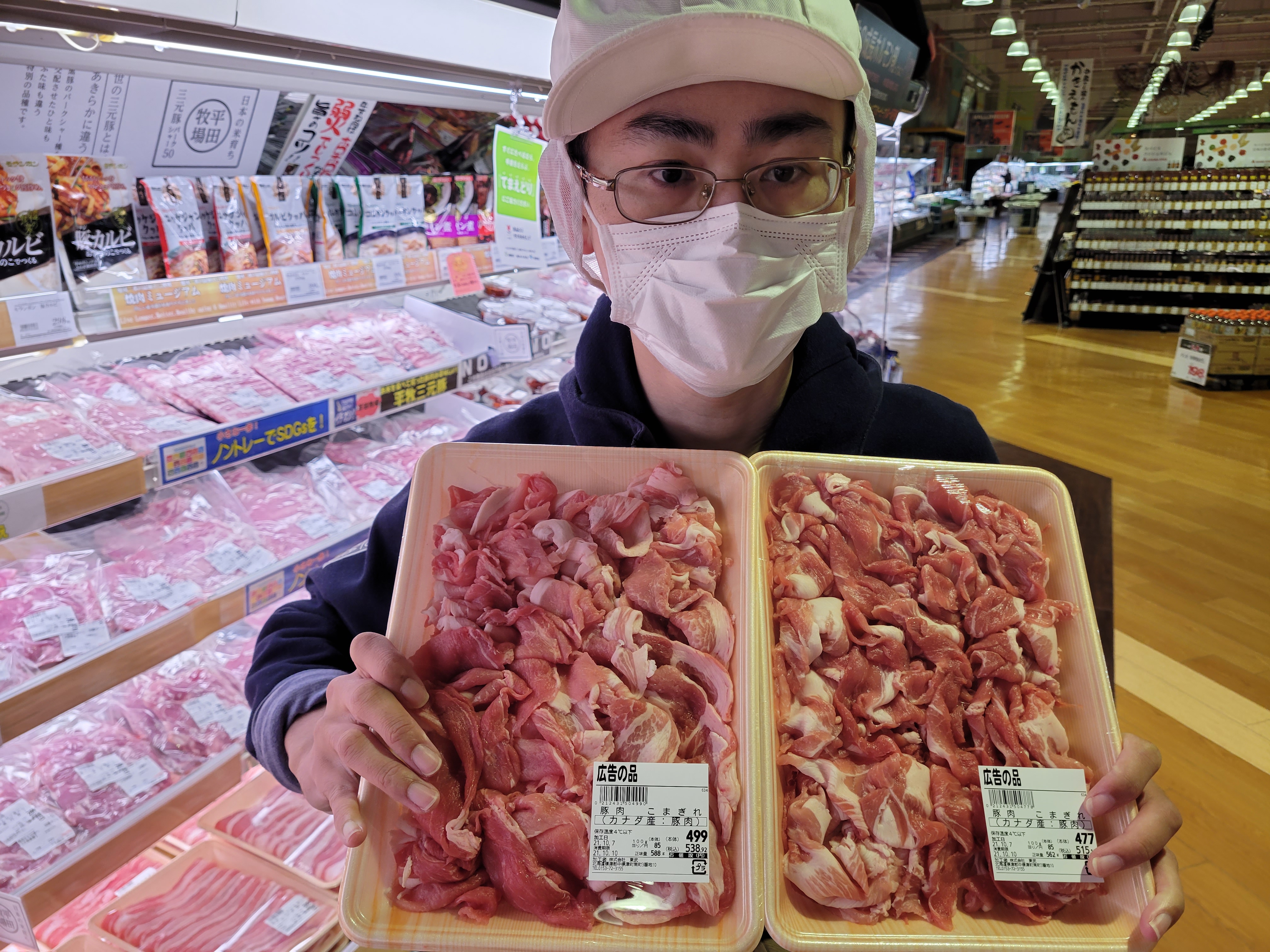 本日ミート担当、小平さんのおすすめ豚肉切り落としがイチオシです🎵時短メニュー生姜焼きに最適切らずにそのまま調理できます。本日は競合店に対抗して100g当たり85円にて販売中ご利用下さいね😄