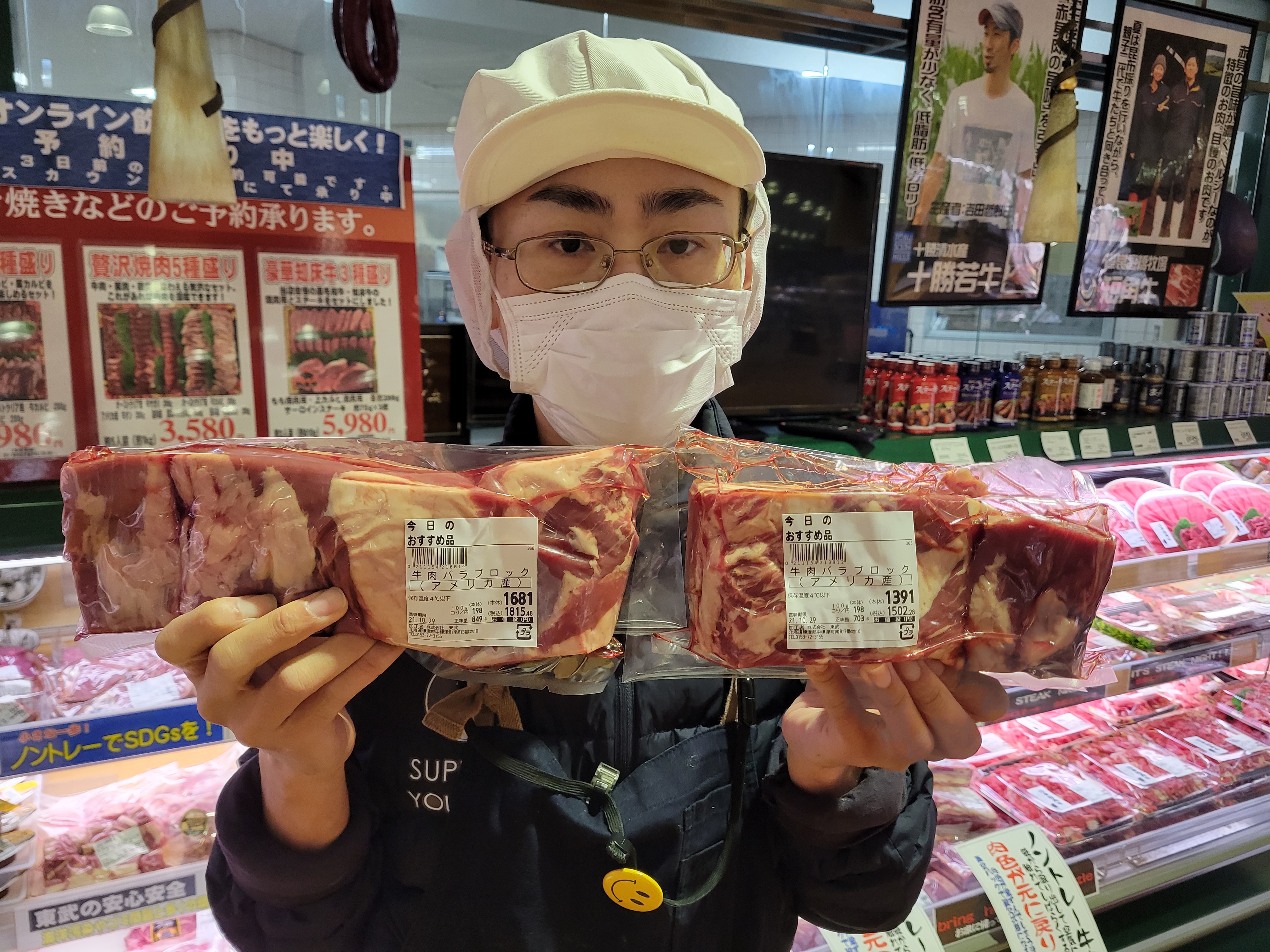 本日ミート担当、小平さんのイチオシノントレー牛肉バラブロックがおすすめです🎵脂身と赤身が交互に入っており、煮込み料理には、最適ビーフシチューにいかがですか🎵100g当たり198円にて販売中ご利用下さいね😄